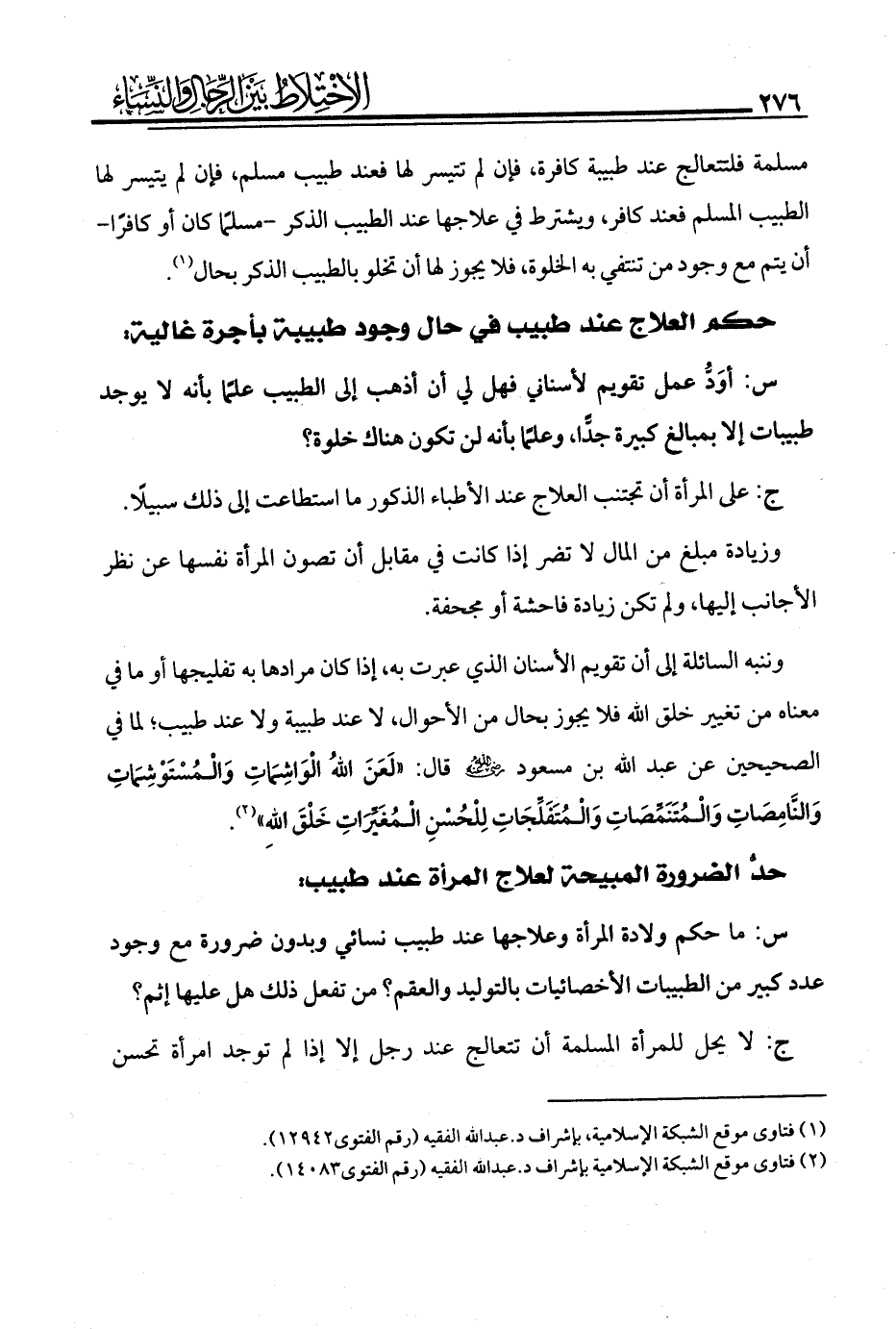 ج: على المرأة أن تجتنب العلاج عند الأطباء الذكور ما استطاعت إلى ذلك سبيلًا.