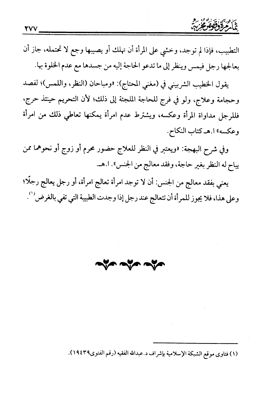 التطبيب، فإذا لم توجد، وخشي على المرأة أن تهلك أو يصيبها وجع لا تحتمله، جاز أن يعالجها رجل فيمس وينظر إلى ما تدعو الحاجة إليه من جسدها مع عدم الخلوة بها.