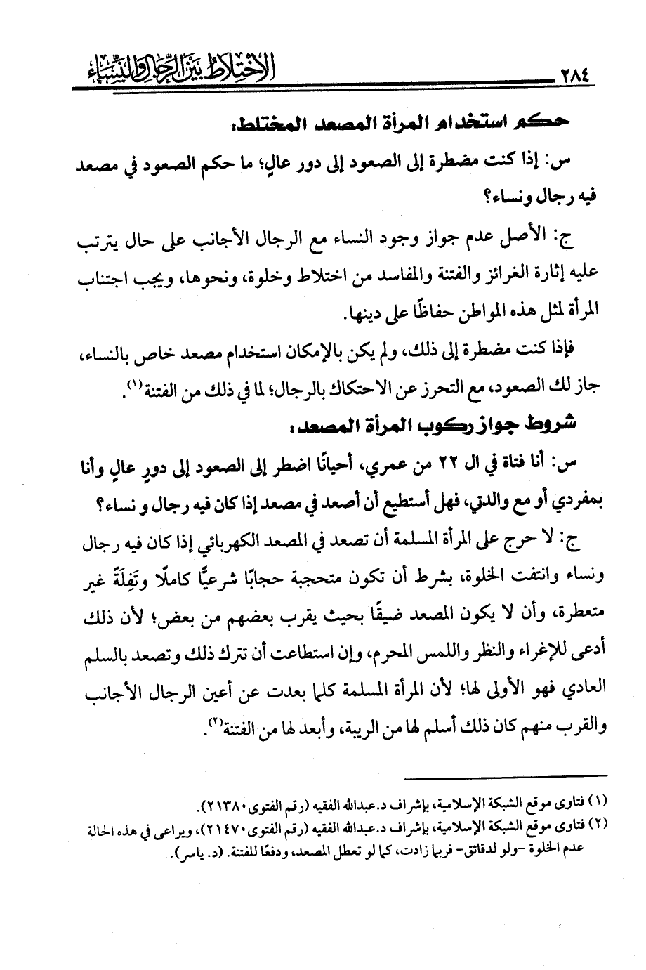 (¬1) فتاوى موقع الشبكة الإسلامية، بإشراف د. عبد الله الفقيه، (رقم الفتوى 21380). ويراعى في هذه الحالة عدم الخلوة ـ ولو لدقائق ـ فربما زادت، كما لو تعطل المصعد، ودفعًا للفتنة. (د/ياسر).