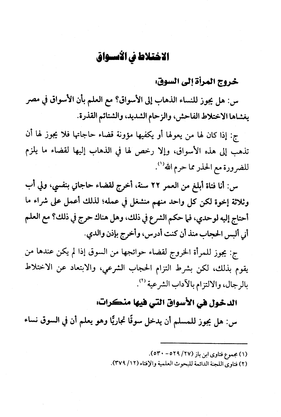 ج: إذا كان لها من يعولها أو يكفيها مؤونة قضاء حاجاتها فلا يجوز لها أن تذهب إلى هذه الأسواق، وإلا رخص لها في الذهاب إليها لقضاء ما يلزم للضرورة مع الحذر مما حرم الله (¬1).