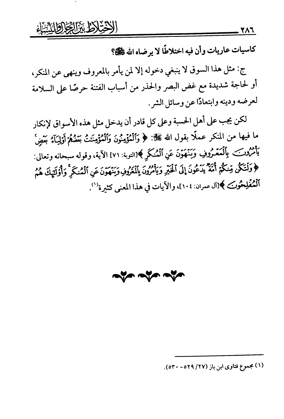 لكن يجب على أهل الحسبة وعلى كل قادر أن يدخل مثل هذه الأسواق لإنكار ما فيها من المنكر عملا بقول الله سبحانه وتعالى: {وَالْمُؤْمِنُونَ وَالْمُؤْمِنَاتُ بَعْضُهُمْ أَوْلِيَاءُ بَعْضٍ يَأْمُرُونَ بِالْمَعْرُوفِ وَيَنْهَوْنَ عَنِ الْمُنْكَرِ} (التوبة: 71) الآية، وقوله سبحانه وتعالى: {وَلْتَكُنْ مِنْكُمْ أُمَّةٌ يَدْعُونَ إِلَى الْخَيْرِ وَيَأْمُرُونَ بِالْمَعْرُوفِ وَيَنْهَوْنَ عَنِ الْمُنْكَرِ وَأُولَئِكَ هُمُ الْمُفْلِحُونَ (104) (آل عمران: 104)، والآيات في هذا المعنى كثيرة (¬1).