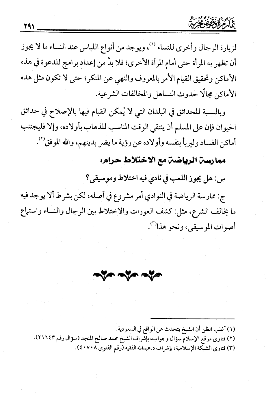 وبالنسبة للحدائق في البلدان التي لا يٌمكن القيام فيها بالإصلاح في حدائق الحيوان فإن على المسلم أن ينتقي الوقت المناسب للذهاب بأولاده وإلا فليجتنب أماكن الفساد وليربأ بنفسه وأولاده عن رؤية ما يضر بدينهم، والله الموفق (¬2).