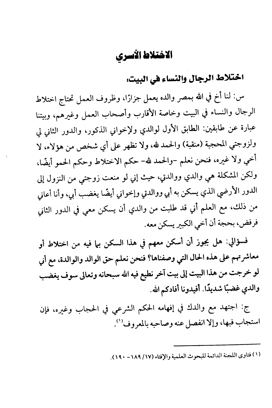 س: لنا أخ في الله بمصر والده يعمل جزارًا، وظروف العمل تحتاج اختلاط الرجال والنساء في البيت وخاصة الأقارب وأصحاب العمل وغيرهم، وبيتنا عبارة عن طابقين: الطابق الأول لوالدي ولإخواني الذكور، والدور الثاني لي ولزوجتي المحجبة (منقبة) والحمد لله، ولا تظهر على أي شخص من هؤلاء، لا أخي ولا غيره، فنحن نعلم والحمد لله حكم الاختلاط وحكم الحمو أيضًا، ولكن المشكلة هي والدي ووالدتي، حيث إني لو منعت زوجتي من النزول إلى الدور الأرضي الذي يسكن به أبي ووالدتي وإخواني أيضا يغضب أبي، وأنا أعاني من ذلك، مع العلم أني قد طلبت من والدي أن يسكن معي في الدور الثاني فرفض، بحجة أن أخي الكبير يسكن معه.