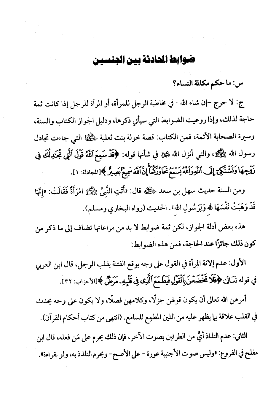 ج: لا حرج ـ إن شاء الله ـ في مخاطبة الرجل للمرأة، أو المرأة للرجل إذا كانت ثمة حاجة لذلك، وإذا روعيت الضوابط التي سيأتي ذكرها، ودليل الجواز الكتاب والسنة، وسيرة الصحابة الأئمة، فمن الكتاب، قصة خولة بنت ثعلبة - رضي الله عنها - التي جاءت تجادل رسول الله - صلى الله عليه وآله وسلم -، والتي أنزل الله عز وجل في شأنها قوله: {قَدْ سَمِعَ اللَّهُ قَوْلَ الَّتِي تُجَادِلُكَ فِي زَوْجِهَا وَتَشْتَكِي إِلَى اللَّهِ وَاللَّهُ يَسْمَعُ تَحَاوُرَكُمَا إِنَّ اللَّهَ سَمِيعٌ بَصِيرٌ (1)} (المجادلة: 1).