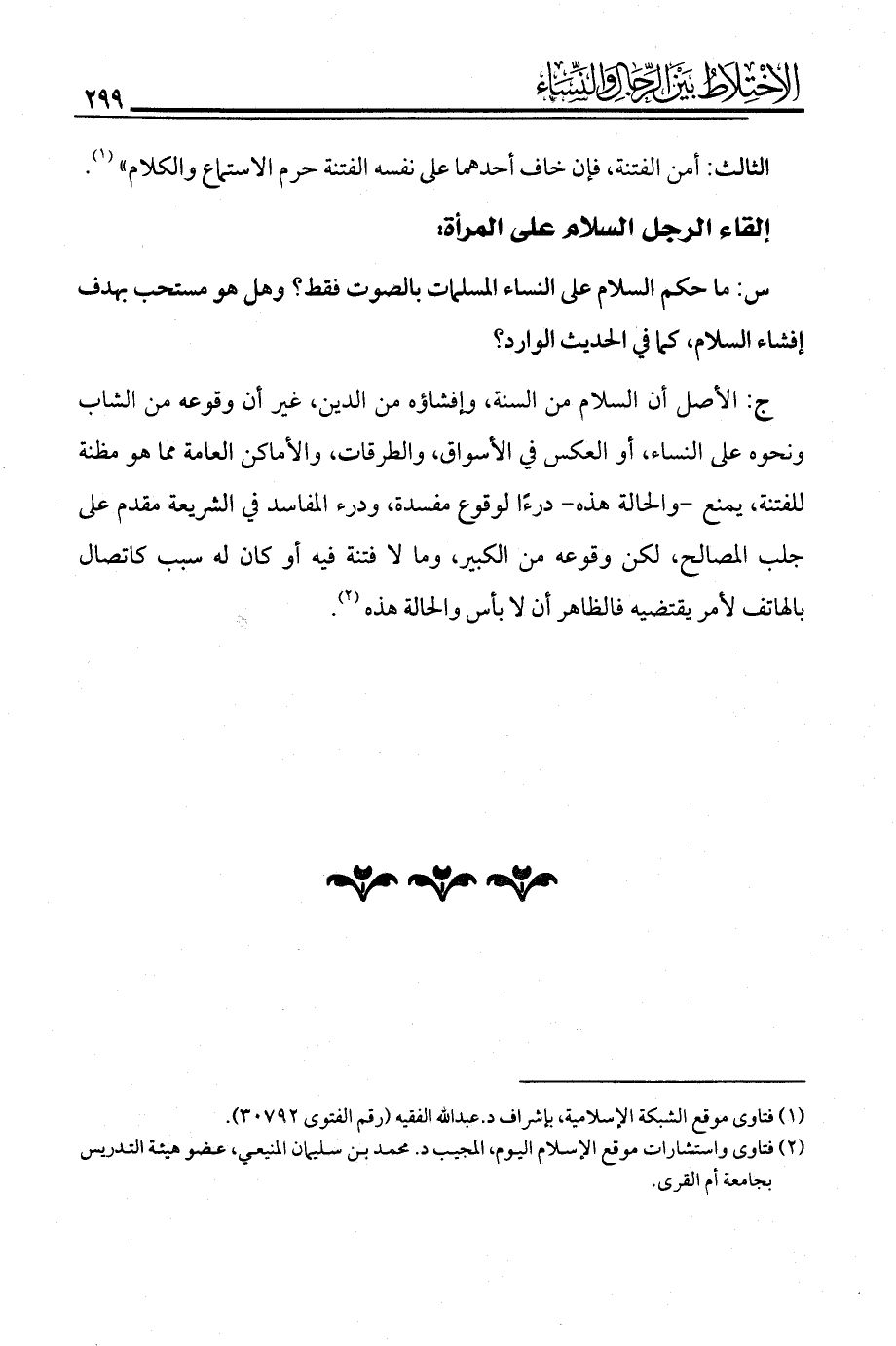 ج: الأصل أن السلام من السنة، وإفشاؤه من الدين، غير أن وقوعه من الشاب ونحوه على النساء، أو العكس في الأسواق، والطرقات، والأماكن العامة مما هو مظنة للفتنة، يمنع والحالة هذه درءًا لوقوع مفسدة، ودرء المفاسد في الشريعة مقدم على جلب المصالح، لكن وقوعه من الكبير، وما لا فتنة فيه أو كان له سبب كاتصال بالهاتف لأمر يقتضيه فالظاهر أن لا بأس والحالة هذه (¬2).