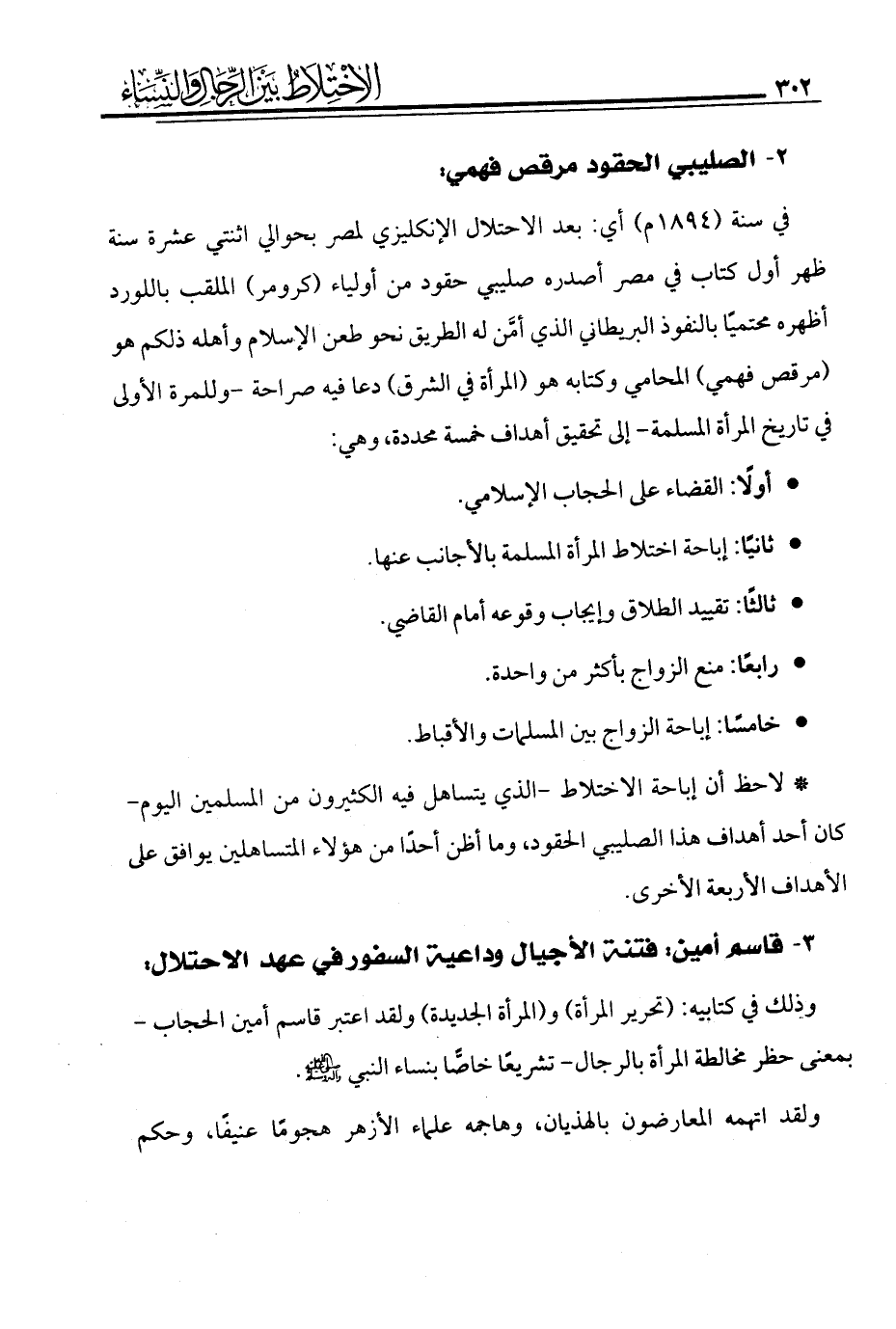 * لاحظ أن إباحة الاختلاط ـ الذي يتساهل فيه الكثيرون من المسلمين اليوم ـ كان أحد أهداف هذا الصليبي الحقود، وما أظن أحدًا من هؤلاء المتساهلين يوافق على الأهداف الأربعة الأخرى.
