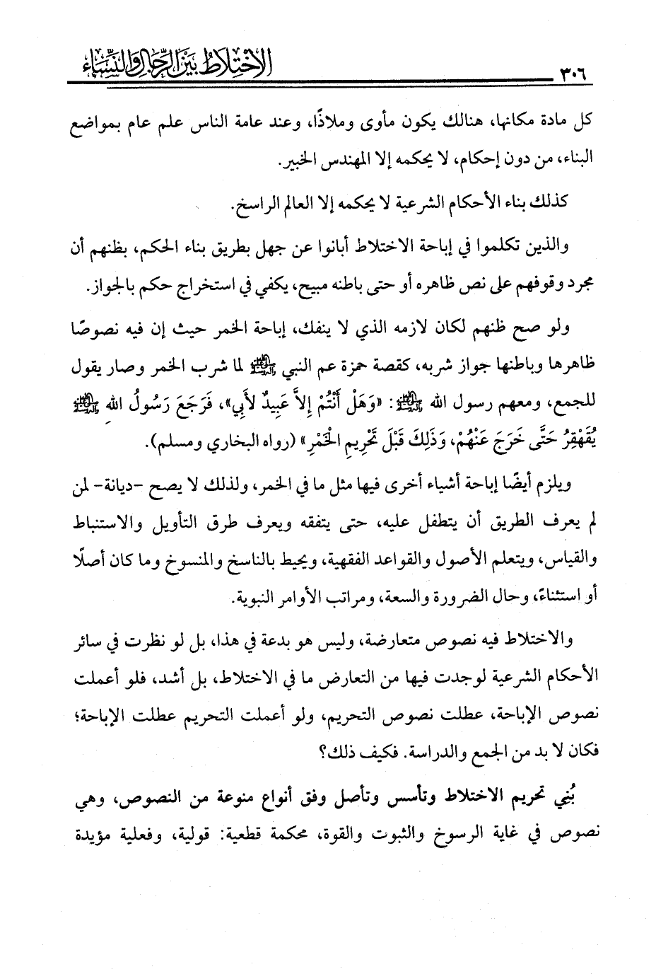 بُنِي تحريم الاختلاط وتأسس وتأصل وفق أنواع منوعة من النصوص، وهي نصوص في غاية الرسوخ والثبوت والقوة، محكمة قطعية: قولية، وفعلية مؤيدة