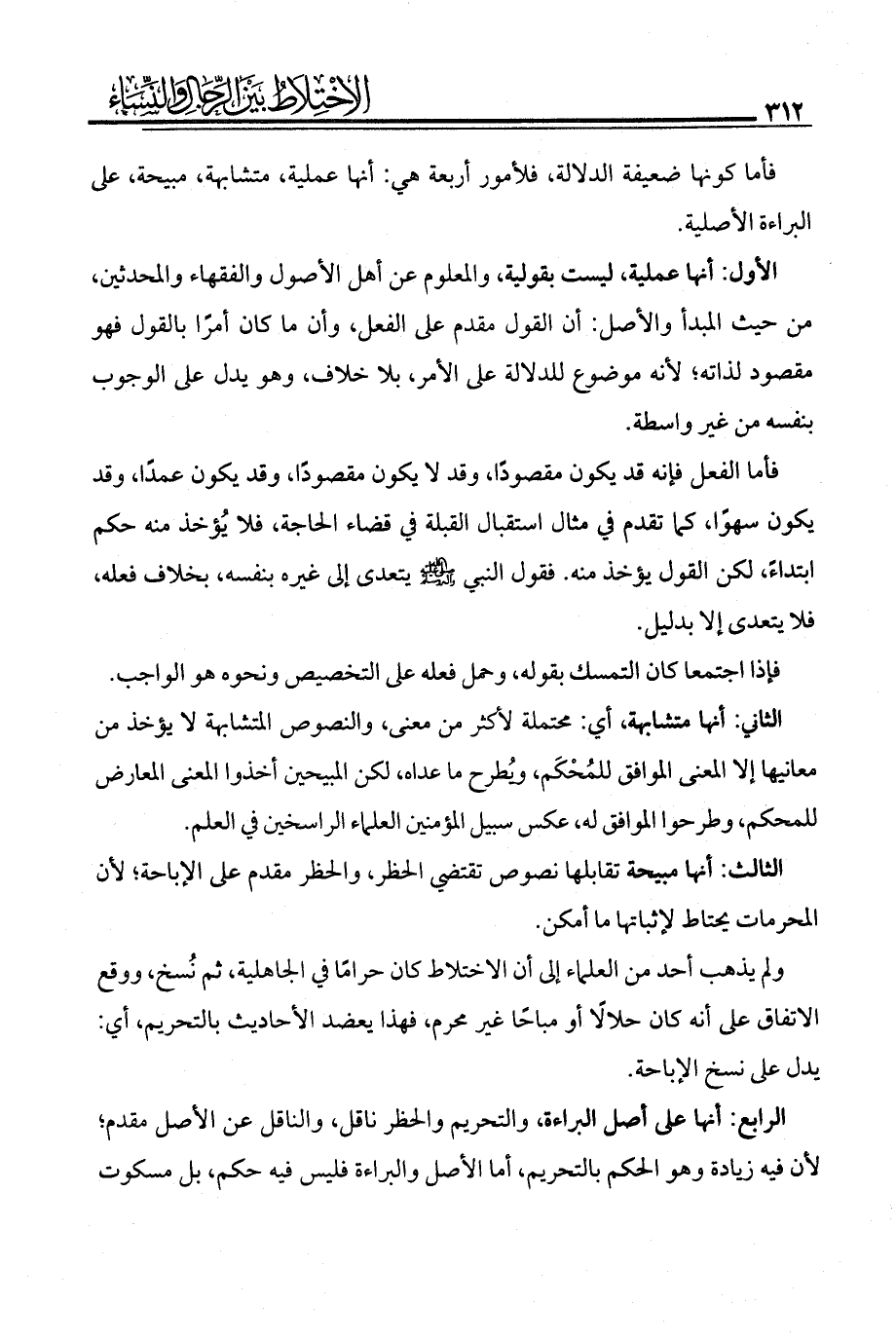 فأما كونها ضعيفة الدلالة، فلأمور أربعة هي: أنها عملية، متشابهة، مبيحة، على البراءة الأصلية.