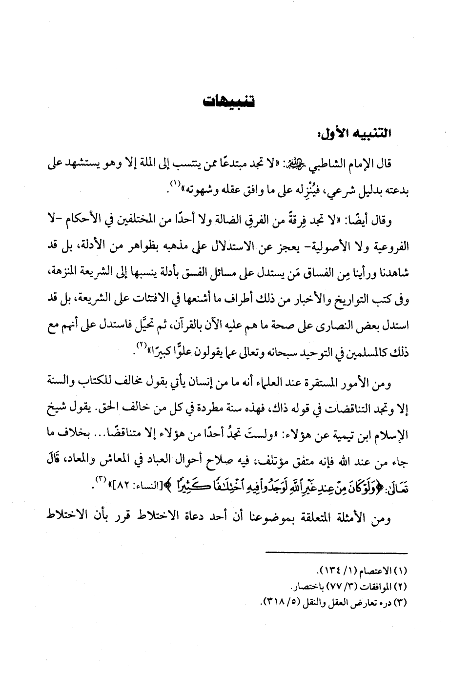 ومن الأمور المستقرة عند العلماء أنه ما من إنسان يأتي بقول مخالف للكتاب والسنة إلا وتجد التناقضات في قوله ذاك، فهذه سنة مطردة في كل من خالف الحق. يقول شيخ الإسلام ابن تيمية عن هؤلاء: «ولستَ تجدُ أحدًا من هؤلاء إلا متناقضًا ... بخلاف ما جاء من عند الله فإنه متفق مؤتلف، فيه صلاح أحوال العباد في المعاش والمعاد؛ قال تعالى: {وَلَوْ كَانَ مِنْ عِنْدِ غَيْرِ اللَّهِ لَوَجَدُوا فِيهِ اخْتِلَافًا كَثِيرًا (82) (النساء: 82)» (¬3).