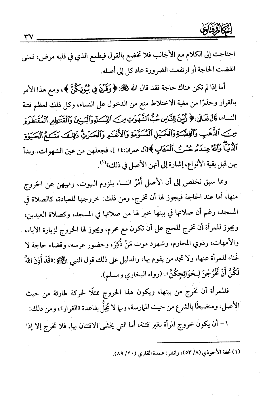 ومما سبق نخلص إلى أن الأصل أمْر النساء بلزوم البيوت، ونهيهن عن الخروج منها، أما عند الحاجة فيجوز لها أن تخرج ومن ذلك خروجها للعبادة، كالصلاة في المسجد رغم أن صلاتها في بيتها خير لها من صلاتها في المسجد، وكصلاة العيدين، ويجوز للمرأة أن تخرج للحج على أن تكون مع محرم، ويجوز لها الخروج لزيارة الآباء , والأمهات , وذوي المحارم , وشهود موت من ذكر , وحضور عرسه وقضاء حاجة لا غَناء للمرأة عنها ولا تجد من يقوم بها. والدليل على ذلك قول النبي - صلى الله عليه وآله وسلم -: «قَدْ أَذِنَ اللهُ لَكُنَّ أَنْ تَخْرُجْنَ لِحَوَائِجِكُنَّ» (رواه البخاري ومسلم).