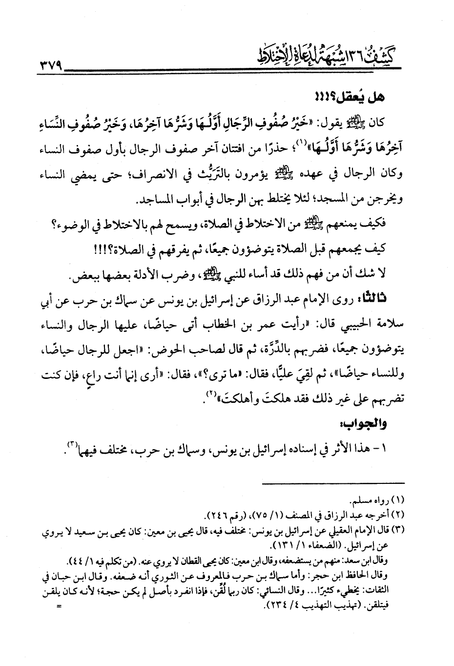 ولا يعقل أن يحجب الصحابة - رضي الله عنهم - وجوه نسائهم عن الرجال الأجانب، ثم يتركونهن يكشفن عن أعضاء الوضوء أمامهم؟!!