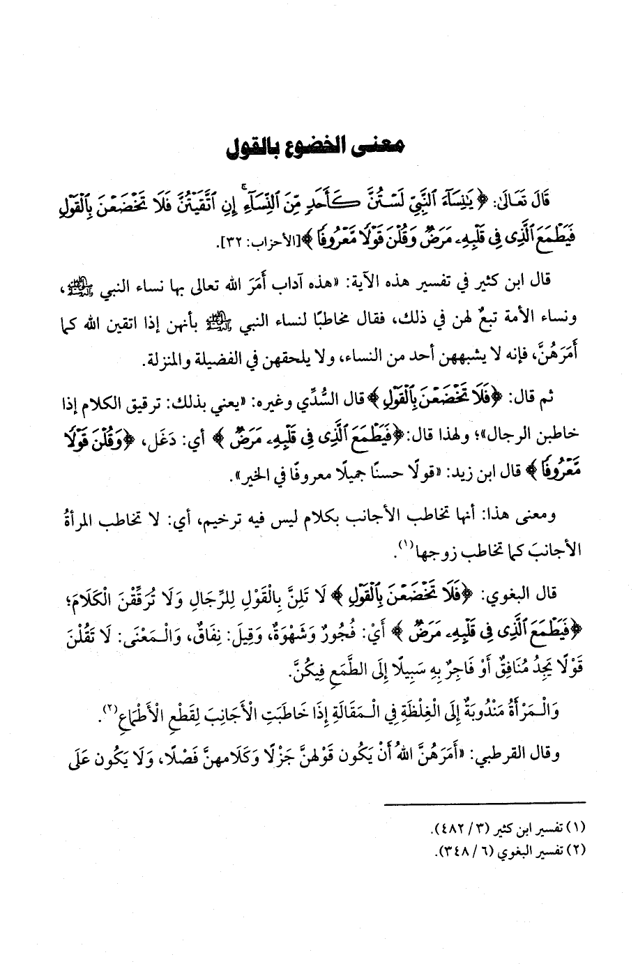 قال تعالى: {يَانِسَاءَ النَّبِيِّ لَسْتُنَّ كَأَحَدٍ مِنَ النِّسَاءِ إِنِ اتَّقَيْتُنَّ فَلَا تَخْضَعْنَ بِالْقَوْلِ فَيَطْمَعَ الَّذِي فِي قَلْبِهِ مَرَضٌ وَقُلْنَ قَوْلًا مَعْرُوفًا (32)} (الأحزاب: 32).