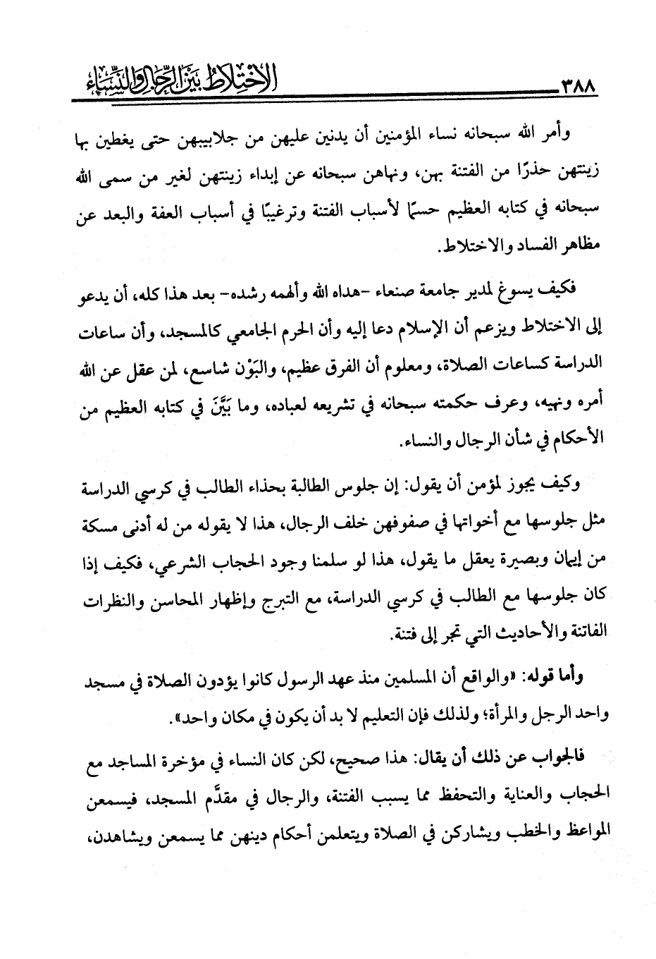 فشرع رسول الله - صلى الله عليه وآله وسلم - فصْل الرجال عن النساء في الصلاة وحث على الابتعاد قدر الاستطاعة خوفًا من الفتنة.