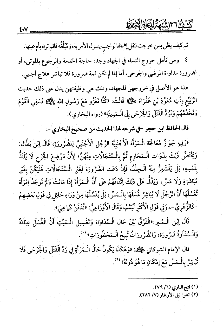 هذا مع أن الحال في موطن الجهاد بعيدة عن الظِنَّةِ، فأنى لمن طُنَّت قدمه أو فُتَّ عضده أن يلتفت يمنة أو يسرة، وهل يُظن بمَنْ تُعايِن أمثال هؤلاء، ومن يشارفون على الهَلَكَة كل حين، بل لاتدري إلى أيِّ شيء يصير أمرها إذا انجلى غبار المعركة، هل يُظن أنّ هذه كغيرها؟ فكيف إذا كُنَّ نساء الصحابة ورجالاتها؟ فكيف يقال بجواز الاختلاط بعد ذلك في مواطن الرِيَبِ وأسباب الفتن. بل كيف يقال بجواز مشاركتهن
