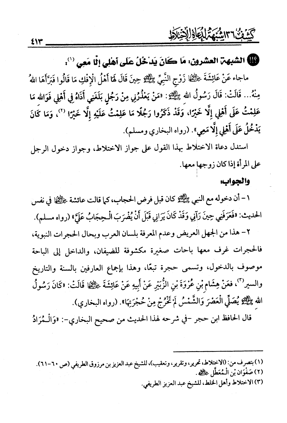 استدلّ بعض دعاة الاختلاط بين الرجال والنساء بحديث أَنَسٍ - رضي الله عنه - أَنَّ جَارًا لِرَسُولِ اللهِ - صلى الله عليه وآله وسلم - فَارِسِيًّا كَانَ طَيِّبَ الْمَرَقِ فَصَنَعَ لِرَسُولِ اللهِ - صلى الله عليه وآله وسلم - ثُمَّ جَاءَ يَدْعُوهُ، فَقَالَ: «وَهَذِهِ» ـ لِعَائِشَةَ ـ فَقَالَ: «لَا»، فَقَالَ رَسُولُ اللهِ - صلى الله عليه وآله وسلم -: «لَا»، فَعَادَ يَدْعُوهُ فَقَالَ رَسُولُ اللهِ - صلى الله عليه وآله وسلم -: «وَهَذِهِ»، قَالَ: «لَا»، قَالَ رَسُولُ اللهِ - صلى الله عليه وآله وسلم -: «لَا» ثُمَّ عَادَ يَدْعُوهُ فَقَالَ رَسُولُ اللهِ - صلى الله عليه وآله وسلم -: «وَهَذِهِ»، قَالَ: «نَعَمْ» فِي الثَّالِثَةِ، فَقَامَا يَتَدَافَعَانِ حَتَّى أَتَيَا مَنْزِلَهُ. (رواه مسلم).