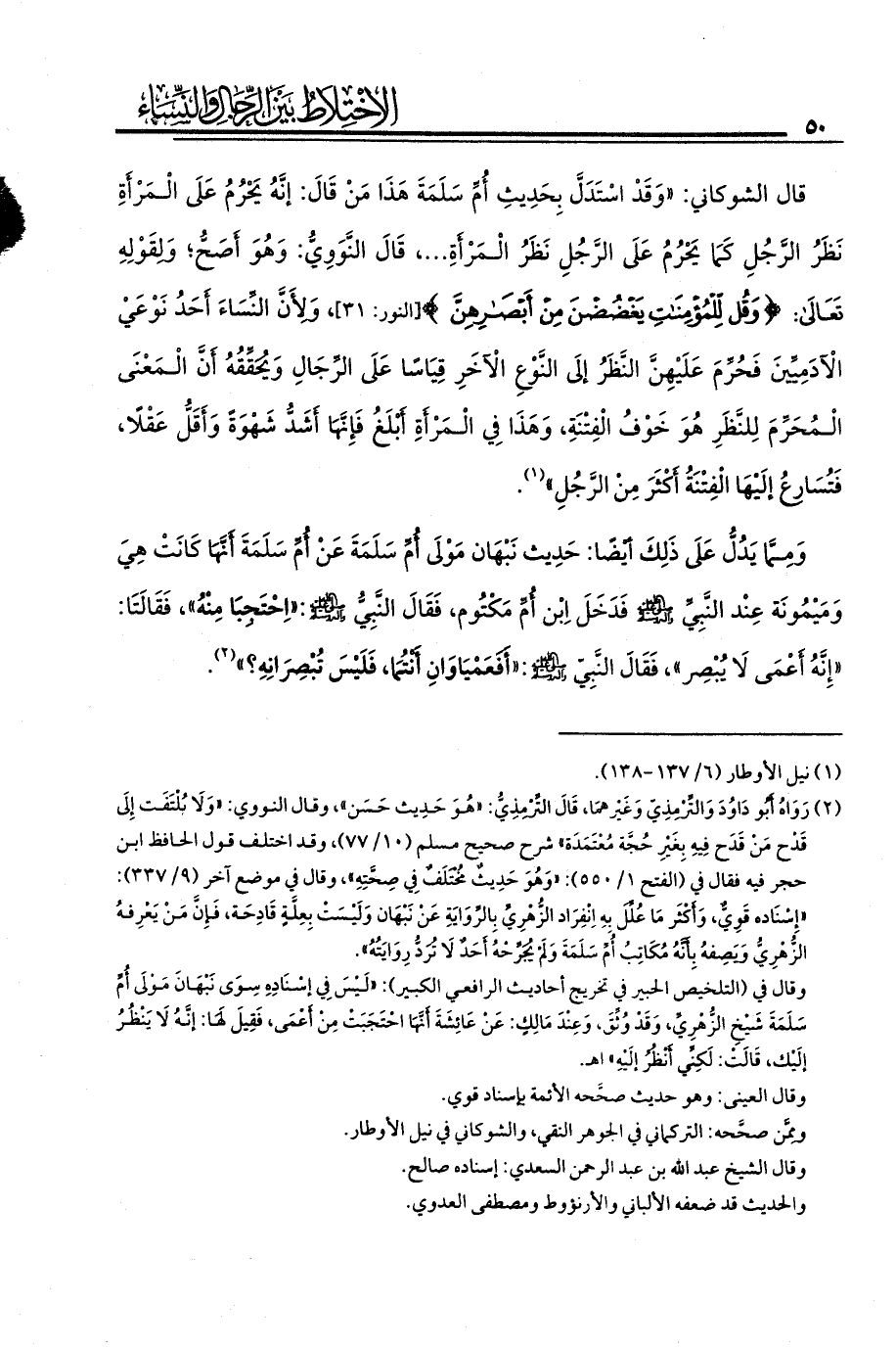 قال الشوكاني: «وَقَدْ اسْتَدَلَّ بِحَدِيثِ أُمِّ سَلَمَةَ هَذَا مَنْ قَالَ: إنَّهُ يَحْرُمُ عَلَى الْمَرْأَةِ نَظَرُ الرَّجُلِ كَمَا يَحْرُمُ عَلَى الرَّجُلِ نَظَرُ الْمَرْأَةِ، ... ، قَالَ النَّوَوِيُّ: وَهُوَ أَصَحُّ، وَلِقَوْلِهِ تعالى: {وَقُلْ لِلْمُؤْمِنَاتِ يَغْضُضْنَ مِنْ أَبْصَارِهِنَّ} (النور: 31)، وَلِأَنَّ النِّسَاءَ أَحَدُ نَوْعَيْ الْآدَمِيِّينَ فَحُرِّمَ عَلَيْهِنَّ النَّظَرُ إلَى النَّوْعِ الْآخَرِ قِيَاسًا عَلَى الرِّجَالِ وَيُحَقِّقُهُ أَنَّ الْمَعْنَى الْمُحَرِّمَ لِلنَّظَرِ هُوَ خَوْفُ الْفِتْنَةِ، وَهَذَا فِي الْمَرْأَةِ أَبْلَغُ فَإِنَّهَا أَشَدُّ شَهْوَةً وَأَقَلُّ عَقْلًا، فَتُسَارِعُ إلَيْهَا الْفِتْنَةُ أَكْثَرَ مِنْ الرَّجُلِ» (¬1).