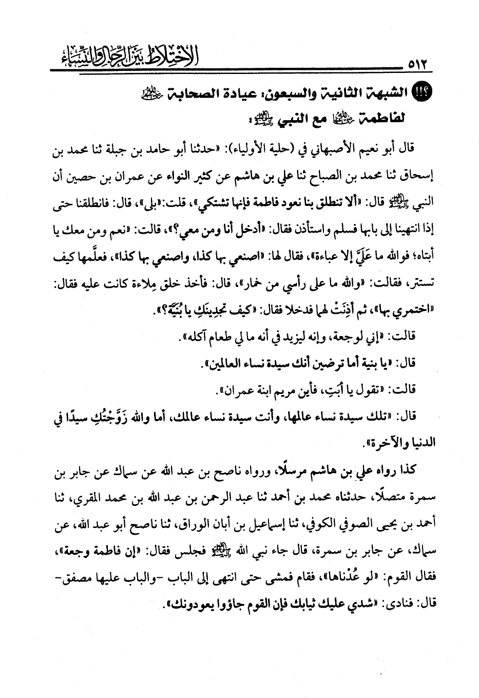 3 - هذا الحديث الضعيف دليل على تحريم الاختلاط حيث إنه يُحَرِّم على المرأة حتى مجرد الكلام مع الرجل الأجنبي، ويستثني حالة الضيف الذي يسأل عن صاحبه، فهو حجة على دعاة الاختلاط.