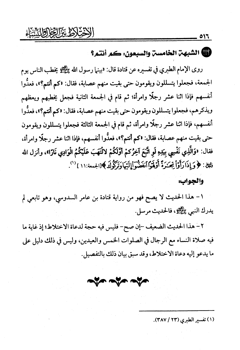 فأين هذا من الاختلاط في العمل أو الدراسة لساعات طويلة مع عدم وجود هذه الضوابط، وشتان بين ذلك وبين زيارة تستغرق دقائق معدودة من امرأة عجوز لمريض في فراشه تؤمن منه ومنها الفتنة (¬3).