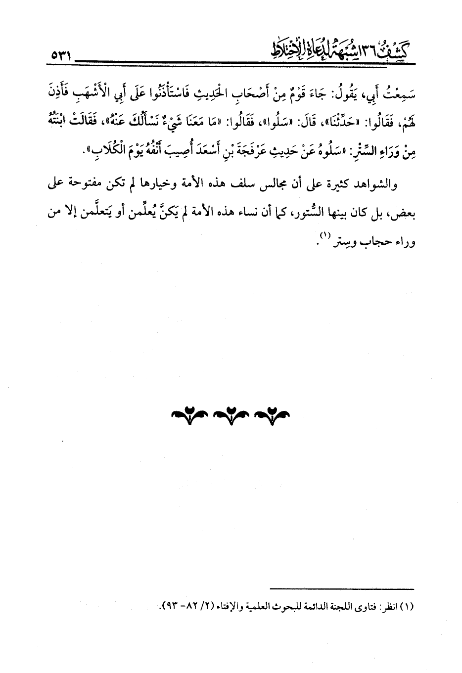 ويقال في ذلك ما قيل في جواب الشبهة الثامنة عشرة والتاسعة عشرة (¬1) من أن هذا محمول على ما إذا وُجِدَتْ الدواعي إلى الدخول عليها عند غيبة زوجها ومحارمها، وأُمِنَتْ الفتنة، وبَعُد التواطؤ منهم على الفاحشة، لا على الإطلاق.