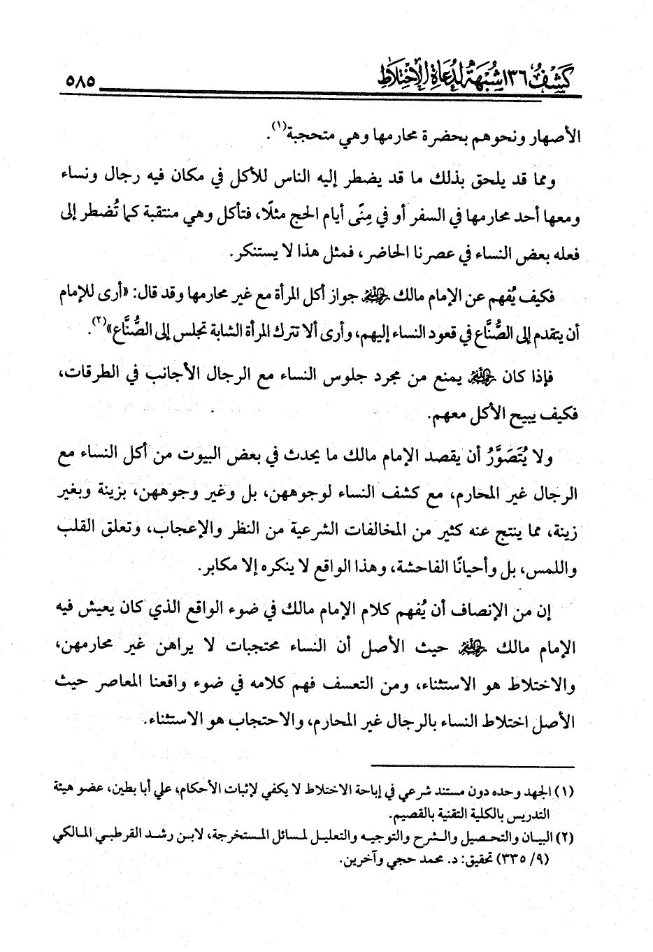 «في كتاب الله تعالى شفاء من هذا المعنى؛ قال الله - عز وجل -: {وَقُلْ لِلْمُؤْمِنَاتِ يَغْضُضْنَ مِنْ أَبْصَارِهِنَّ} (النور:31)، كما قال: {قُلْ لِلْمُؤْمِنِينَ يَغُضُّوا مِنْ أَبْصَارِهِمْ} (النور:30).وقال رسول الله - صلى الله عليه وآله وسلم -: «لاَ يَخْلُوَنَّ رَجُلٌ بِامْرَأَةٍ لَيْسَ مِنْهَا بِذِي مَحْرَم (¬5) وَلَا تُسًافِر امْرَأَةٌ