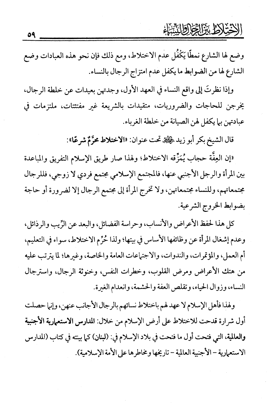 قال الشيخ بكر أبو زيد - رحمه الله - تحت عنوان «الاختلاط محرَّمٌ شرعًا»: