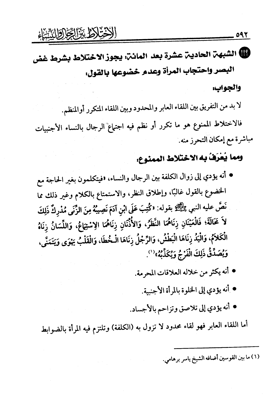 لا يشك عاقلٌ منصف مبتغٍ للحق في أن هذا اللقاء الدائم، أخطر من خلوة قصيرة، ومن تزاحم لحظة على باب مسجد أو خلال الطواف بالبيت، ومن خضوع بالقول مرّة، ومن قرقعة صوت الخلخال في طريق من طرق المسلمين.