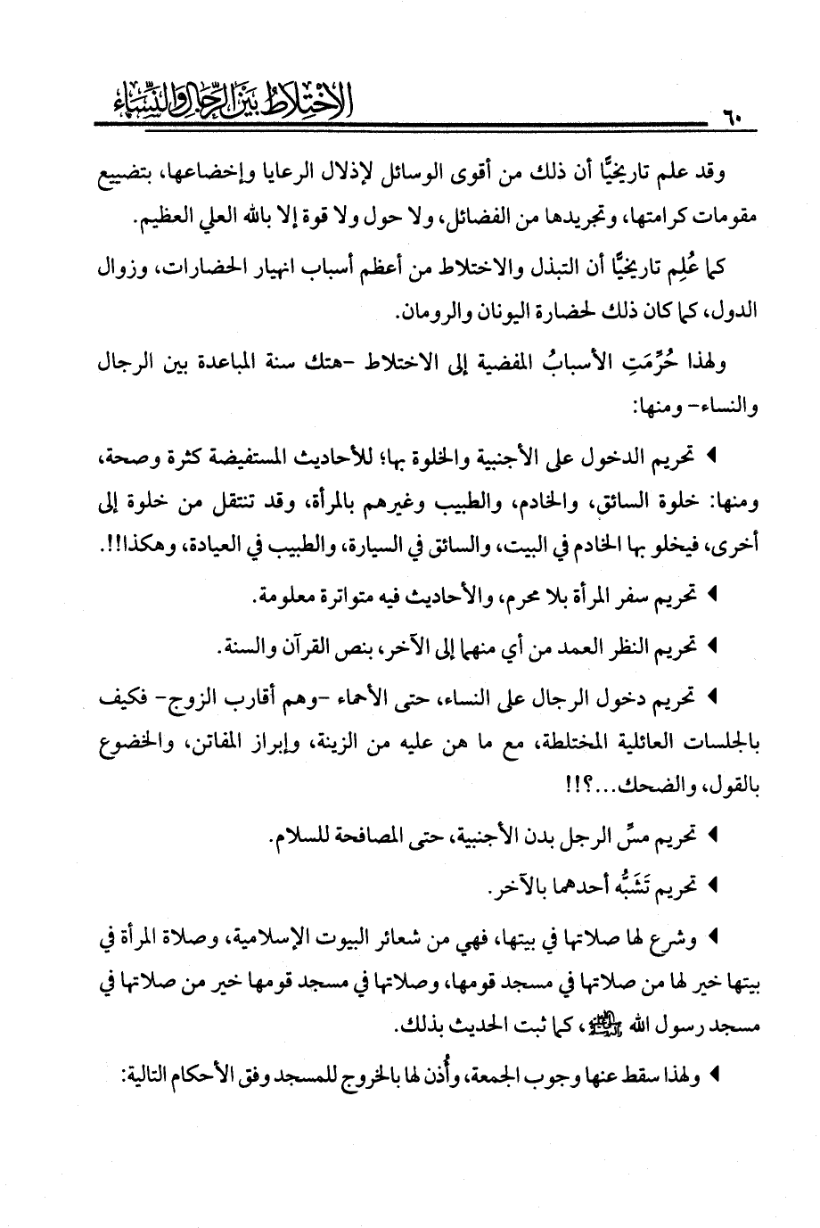 ولهذا حُرِّمَتْ الأسباب المفضية إلى الاختلاط ـ هتك سنة المباعدة بين الرجال والنساء ـ ومنها: