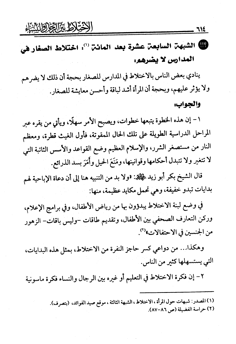 فكل من له أدنى علم بالأدلة الشرعية وبواقع الأمة في هذا العصر من ذوي البصيرة الإسلامية على بنينا وبناتنا يدرك ذلك بلا شك، وأعتقد أن هذا الاقتراح مما ألقاه الشيطان أو بعض نوابه على لسان فائزة ونورة المذكورتين وهو بلا شك مما يسر أعداءنا وأعداء الإسلام ومما يدعون إليه سرًا وجهرًا.