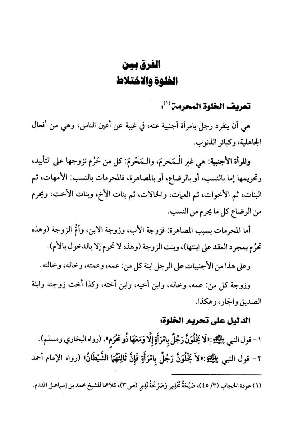 1 - قول النبي - صلى الله عليه وآله وسلم -: «لَا يَخْلُوَنَّ رَجُلٌ بِامْرَأَةٍ إِلَّا وَمَعَهَا ذُو مَحْرَمٍ» (رواه البخاري ومسلم).
