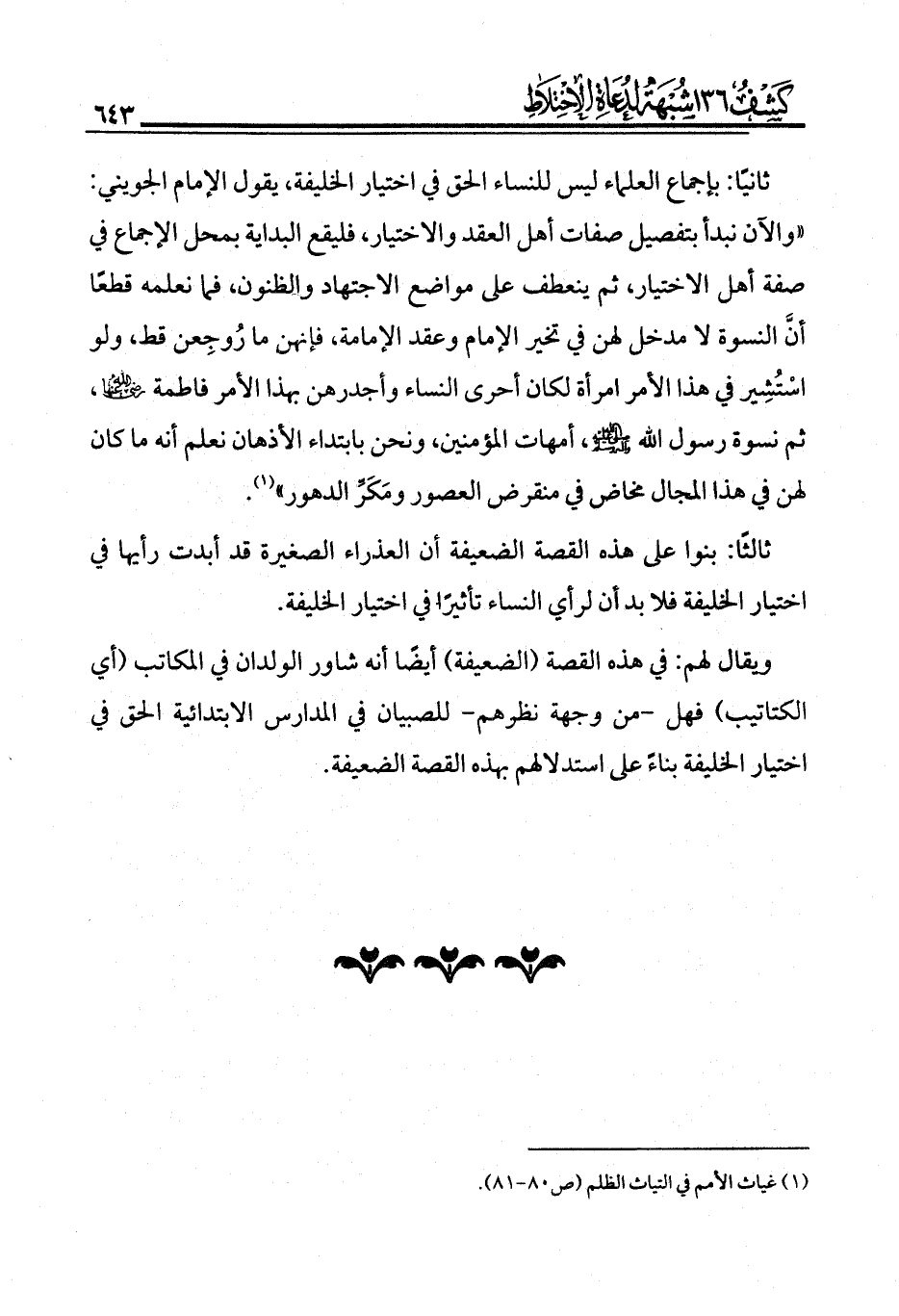 ويقال أيضًا للمنتسبين إلى علم الشريعة الذين يخصصون دلالة حديث «لَنْ يُفْلِحَ قَوْمٌ وَلَّوْا أَمْرَهُمُ امْرَأَةً» بغير دليل، ويُقصِرون التحريم على منصب رئاسة الدولة فقط، يقال لهم: إن المطالبين اليوم بمنح المرأة حق الترشيح والانتخاب، إنما ينطلقون من مبدأ علماني لاديني، مبني على المساواة بين الرجال والنساء في كل