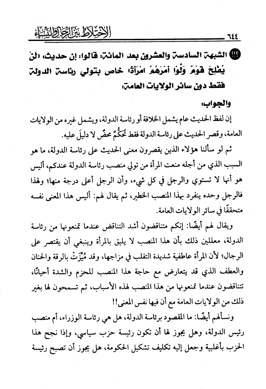 وسوف يطالبونكم يومًا من الأيام بالتراجع أيضًا عن تحريم منصب رئيس الدولة على النساء، وسوف يسألونكم: ما الفرق بين منحِكم المرأة حق تولي رئاسة الوزراء، أو رئاسة حزب سياسي ذي أغلبية، أو رئاسة البرلمان، ومنعِكم إياها من رئاسة الدولة في نظام الدولة الحديث الذي يحدد مهام رئيس الدولة في اختصاصات معينة لا يتعداها، وسوف تحارون جوابا وتغلبون؟ فخير لكم أن تتمسكوا بظاهر النص وعمومه، من أن تخصصوه بغير برهان سوى التحكم المحض.