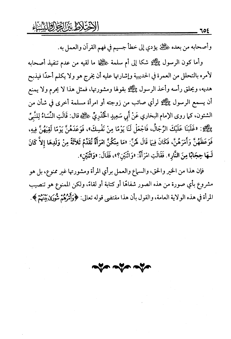 ومن أجل ذلك لم يكن للنساء في هذا الأمر شأن قط لا في عهد الرسول - صلى الله عليه وآله وسلم - ولا