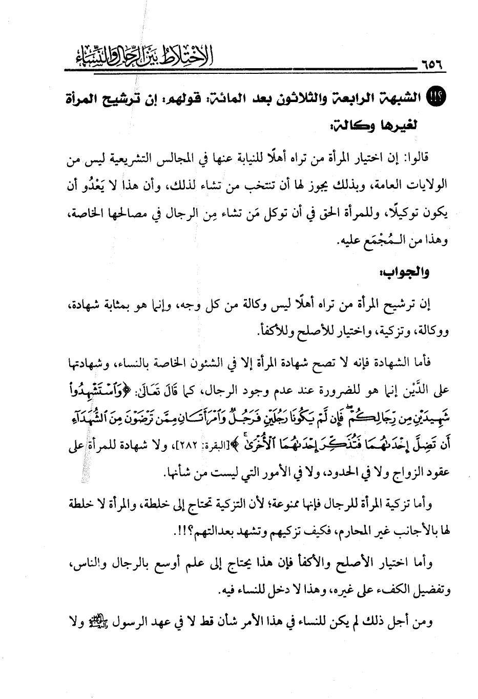 قضية أن المرأة يصح أن تكون مفتية لا يردها عاقل، وهي تستطيع أن تفعل ذلك وهي في بيتها بدون خروج أو اختلاط بالرجال، وفرق بين الإفتاء وبين الخروج للقضاء الذي يقتضي الاختلاط والاستماع للخصوم ووضع مساعدين، والتعرف على ما يحدث في الخارج والسفر وغير ذلك.