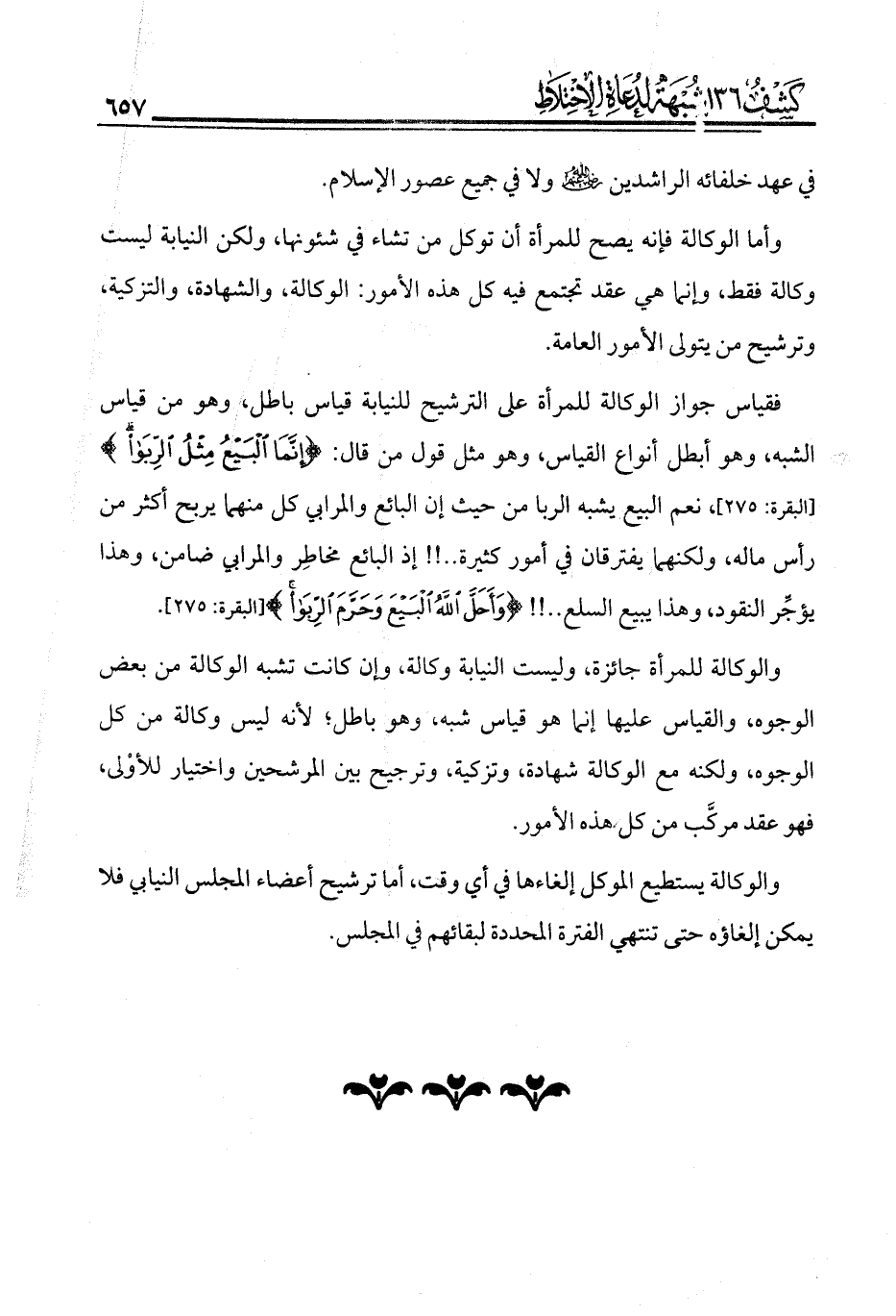 ومما استدلوا به في جواز تولية المرأة الولايات العامة قولهم إن الأحكام تتغير بتغير الزمان والمكان، وإنّ مَنْع الرسول - صلى الله عليه وآله وسلم - النساء من الولايات العامة وقوله عن أهل فارس لما ولوا بنت ملكهم: «لَنْ يُفْلِحَ قَوْمٌ وَلَّوْا أَمْرَهُمُ امْرَأَةً» (¬1) أن ذلك كان لأن النساء لم يكُنَّ يتعلمْن في ذلك الوقت، وكُنَّ بعيدات عن أمور السياسة والحكم، وأما الآن فإن التعليم شمل الرجال والنساء، وقد تكون المرأة أعظم تعليمًا من الرجل، فيجب قصر هذا الحكم على زمان الرسول - صلى الله عليه وآله وسلم -.