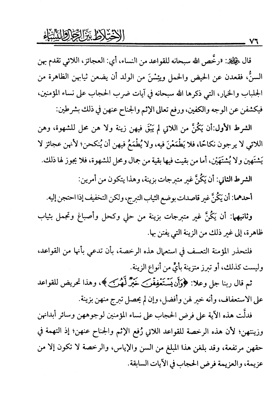 قال - رحمه الله -: «رخَّص الله سبحانه للقواعد من النساء، أي: العجائز، اللائي تقدم بهن السنّ، فقعدن عن الحيض والحمل ويئِسْنَ من الولد أن يضعن ثيابهن الظاهرة من الجلباب والخمار، التي ذكرها الله سبحانه في آيات ضرب الحجاب على نساء المؤمنين، فيكشفن عن الوجه والكفين، ورفع تعالى الإثم والجناح عنهن في ذلك بشرطين: