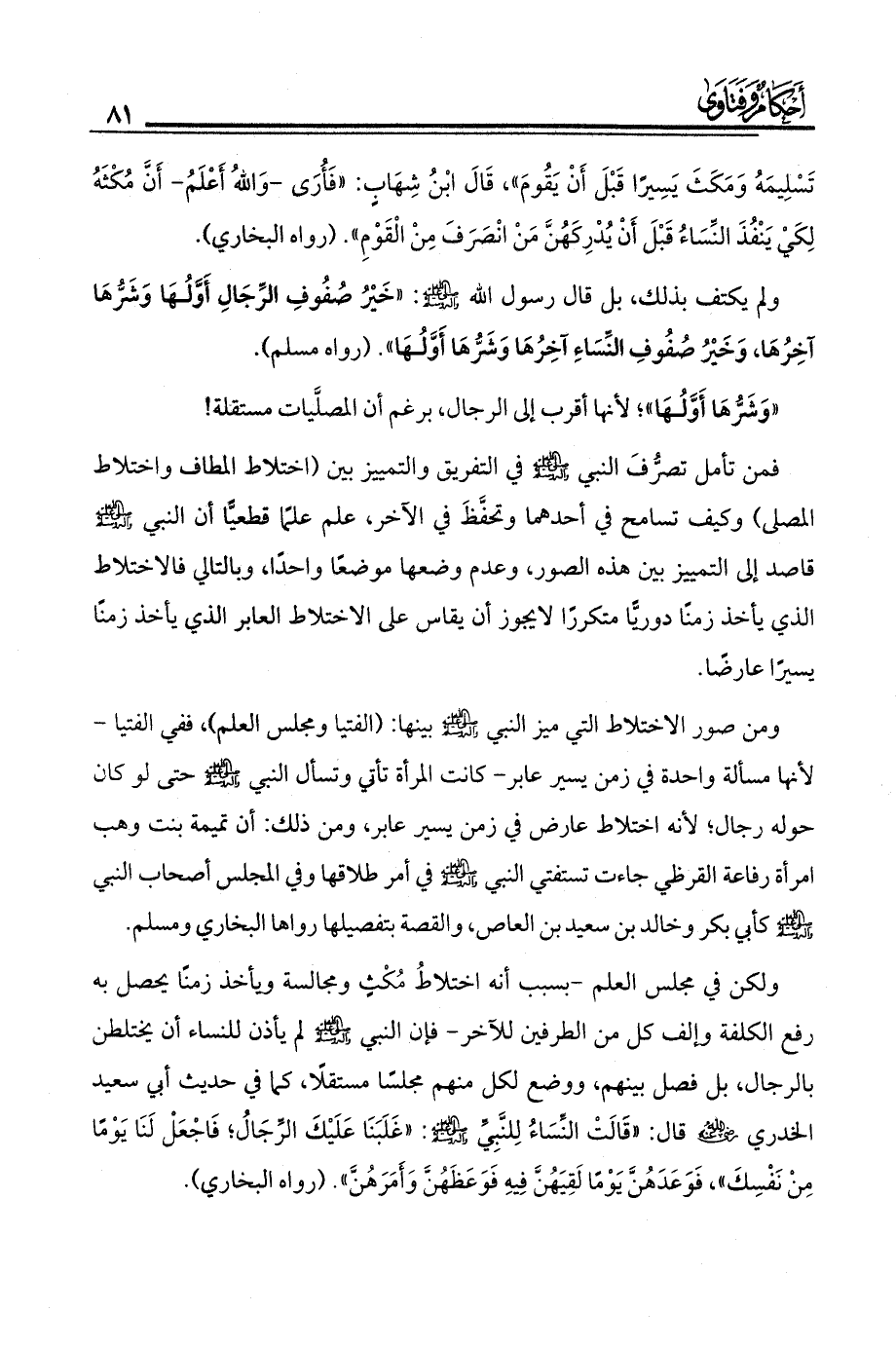 ولكن في مجلس العلم ـ بسبب أنه اختلاط مُكْث ومجالسة ويأخذ زمنًا يحصل به رفع الكلفة وإلف كل من الطرفين للآخر ـ فإن النبي - صلى الله عليه وآله وسلم - لم يأذن للنساء أن يختلطن بالرجال، بل فصل بينهم، ووضع لكل منهم مجلسًا مستقلًا، كما في حديث أبي سعيد الخدري - رضي الله عنه - قال: «قَالَتْ النِّسَاءُ لِلنَّبِيِّ - صلى الله عليه وآله وسلم -: «غَلَبَنَا عَلَيْكَ الرِّجَالُ؛ فَاجْعَلْ لَنَا يَوْمًا مِنْ نَفْسِكَ»، فَوَعَدَهُنَّ يَوْمًا لَقِيَهُنَّ فِيهِ فَوَعَظَهُنَّ وَأَمَرَهُنَّ» (رواه البخاري).