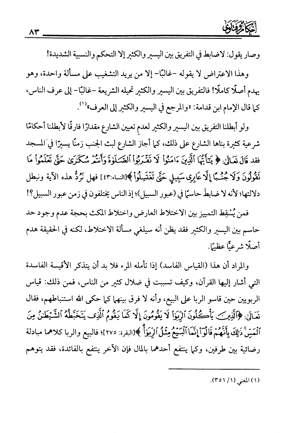ولو أبطلنا التفريق بين اليسير والكثير لعدم تعيين الشارع مقدارًا فارقًا لأبطلنا أحكامًا شرعية كثيرة بناها الشارع على ذلك، كما أجاز الشارع لبث الجنب زمنًا يسيرًا في المسجد فقد قال تعالى: {يَاأَيُّهَا الَّذِينَ آمَنُوا لَا تَقْرَبُوا الصَّلَاةَ وَأَنْتُمْ سُكَارَى حَتَّى تَعْلَمُوا مَا تَقُولُونَ وَلَا جُنُبًا إِلَّا عَابِرِي سَبِيلٍ حَتَّى تَغْتَسِلُوا} (النساء:43) فهل نَرُدّ هذه الآية ونبطل دلالتها لأنه لا ضابط حاسم في (عبور السبيل)؛ إذ الناس يختلفون في زمن عبور السبيل؟!