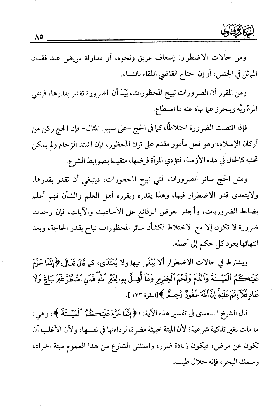 ومثل الحج سائر الضرورات التي تبيح المحظورات، فينبغي أن تقدر بقدرها، ولايتعدى قدر الاضطرار فيها، وهذا يقدره ويقرره أهل العلم والشأن فهم أعلم بضابط الضروريات وأجدر بعرض الوقائع على الأحاديث والآيات، فإن وجدت ضرورة لا تكون إلاّ مع الاختلاط فكشأن سائر المحظورات تباح بقدر الحاجة، وبعد انتهائها يعود كل حكم إلى أصله.