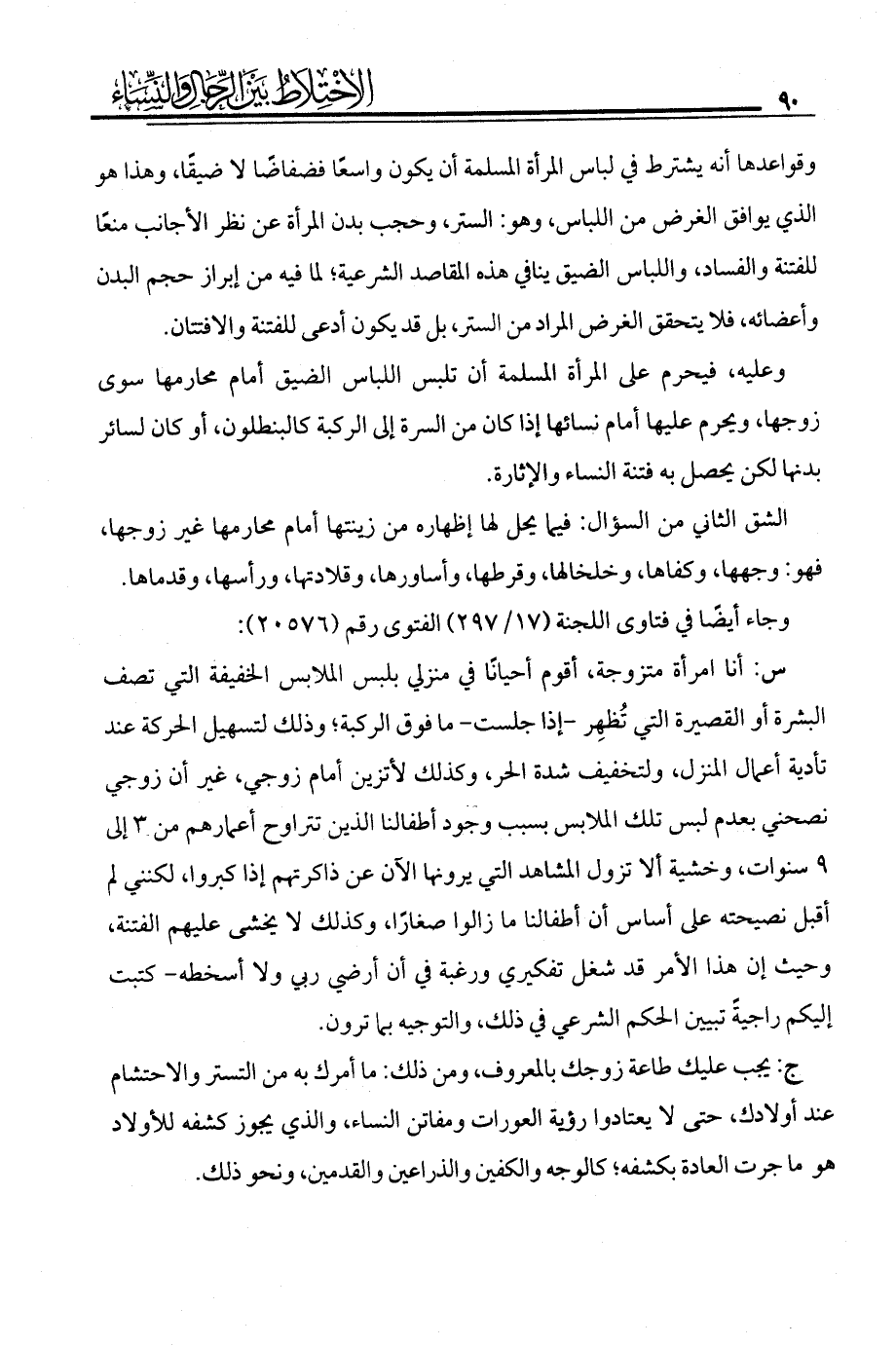 وقواعدها أنه يشترط في لباس المرأة المسلمة أن يكون واسعًا فضفاضًا لا ضيقًا، وهذا هو الذي يوافق الغرض من اللباس، وهو: الستر، وحجب بدن المرأة عن نظر الأجانب منعا للفتنة والفساد، واللباس الضيق ينافي هذه المقاصد الشرعية؛ لما فيه من إبراز حجم البدن وأعضائه، فلا يتحقق الغرض المراد من الستر، بل قد يكون أدعى للفتنة والافتتان.