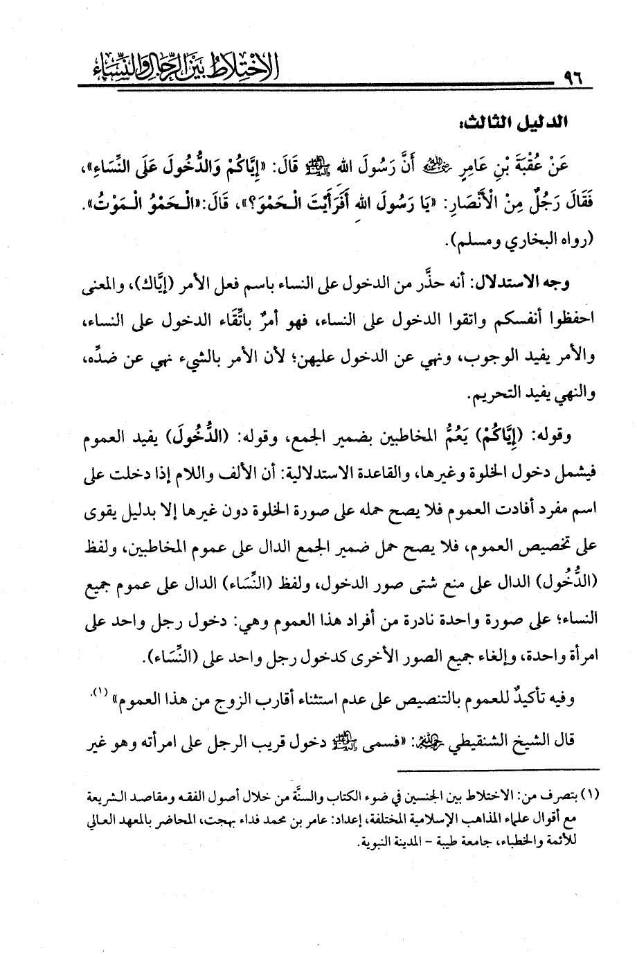 (¬1) بتصرف من الاختلاط بين الجنسين في ضوء الكتاب والسنّة من خلال أصول الفقه ومقاصد الشريعة مع أقوال علماء المذاهب الإسلامية المختلفة، إعداد/عامر بن محمد فداء بهجت، المحاضر بالمعهد العالي للأئمة والخطباء ـ جامعة طيبة ـ المدينة النبوية.