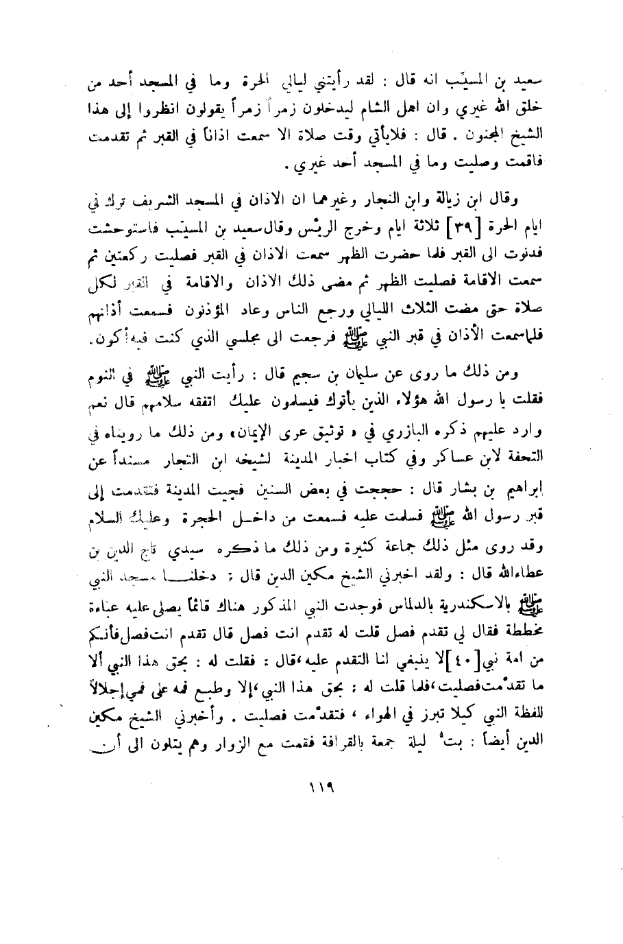 ذكره البارزي في (توثيق عرى الإيمان) ومن ذلك ما رويناه في التحفة لابن عساكر وفي كتاب أخبار المدينة لشيخه ابن النجار مسنداً عن إبراهيم بن بشار قال: حججت في بعض السنين فجيت المدينة فتقدمت إلى قبر الرسول صلى الله عليه وسلم فسلمت عليه فسمعت من داخل الحجرة وعليك السلام، وقد روى مثل ذلك جماعة كثيرة ومن ذلك ما ذكره سيدي تاج الدين بن عطاء الله قال: ولقد أخبرني الشيخ مكين الدين قال: دخلنا مسجد النبي صلى الله عليه وسلم بالإسكندرية بالدلماس فوجدت النبي المذكور هناك قائماً يصلي عليه عباءة مخططه فقال لي تقدم فصل قلت: له تقدم أنت فصل قال: تقدم أنت فصل فإنكم من أمة نبي لا ينبغي لنا التقدم عليه، قال فقلت له: بحق هذا النبي ألا ما تقدمت فصليت، فلما قلت له: بحق هذا النبي، إلا وطبع فمه على فمي إجلالاً للفظة النبي كيلا تبرز في الهواء، فتقدمت فصليت وأخبرني الشيخ مكين الدين أيضاً: بت ليلة جمعة بالقرافة فقمت مع الزوار فهم يتلون إلى أن