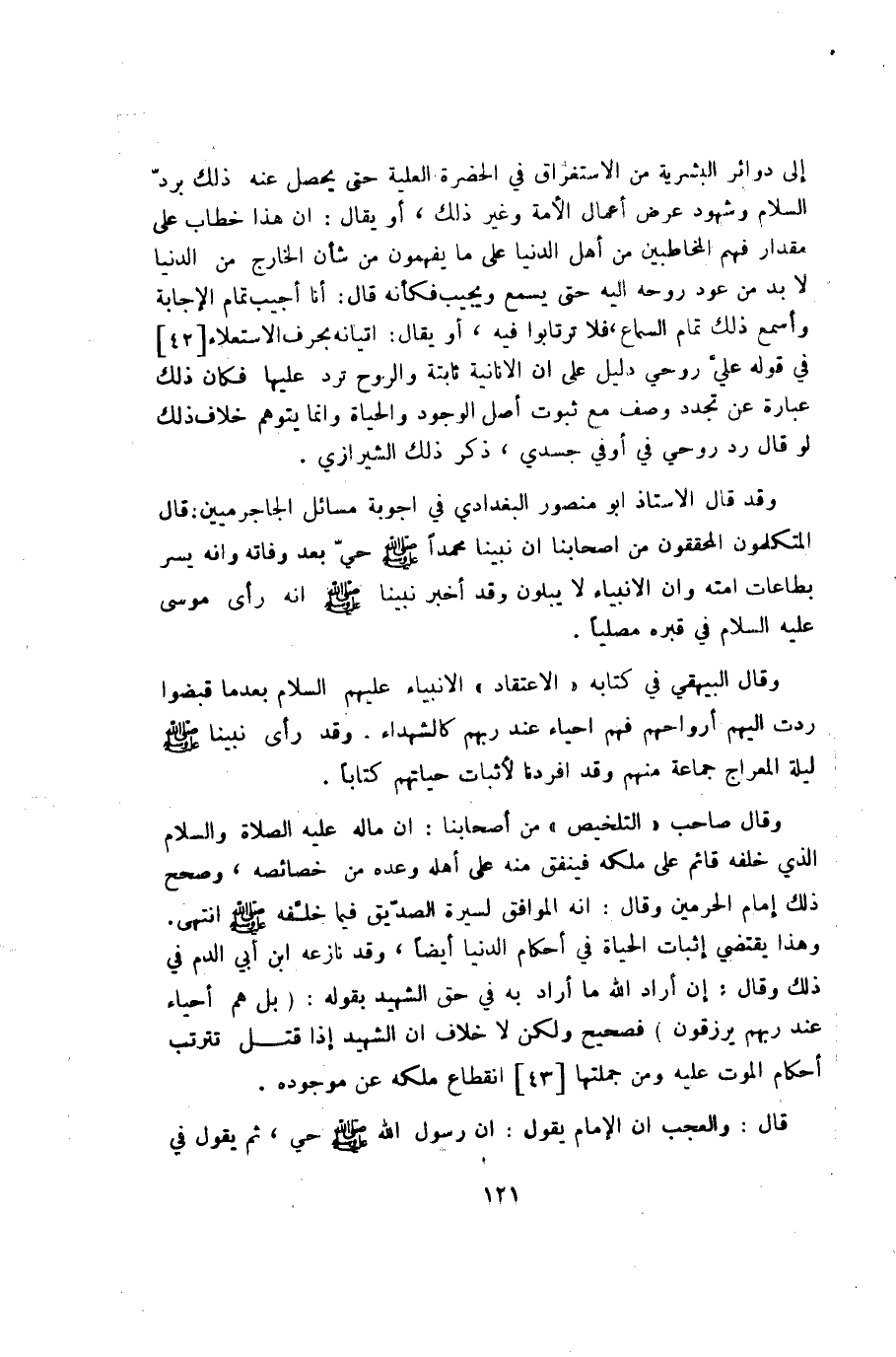 وقد قال الأستاذ أبو منصور البغدادي في أجوبة مسائل الجاجرميين: قال المتكلمون المحققون من أصحابنا أن نبينا محمد صلى الله عليه وسلم حي بعد وفاته وأنه يسر بطاعات أمته وأن الأنبياء لا يبلون وقد أخبر نبينا صلى الله عليه وسلم أنه رأى موسى عليه السلام في قبره مصلياً.