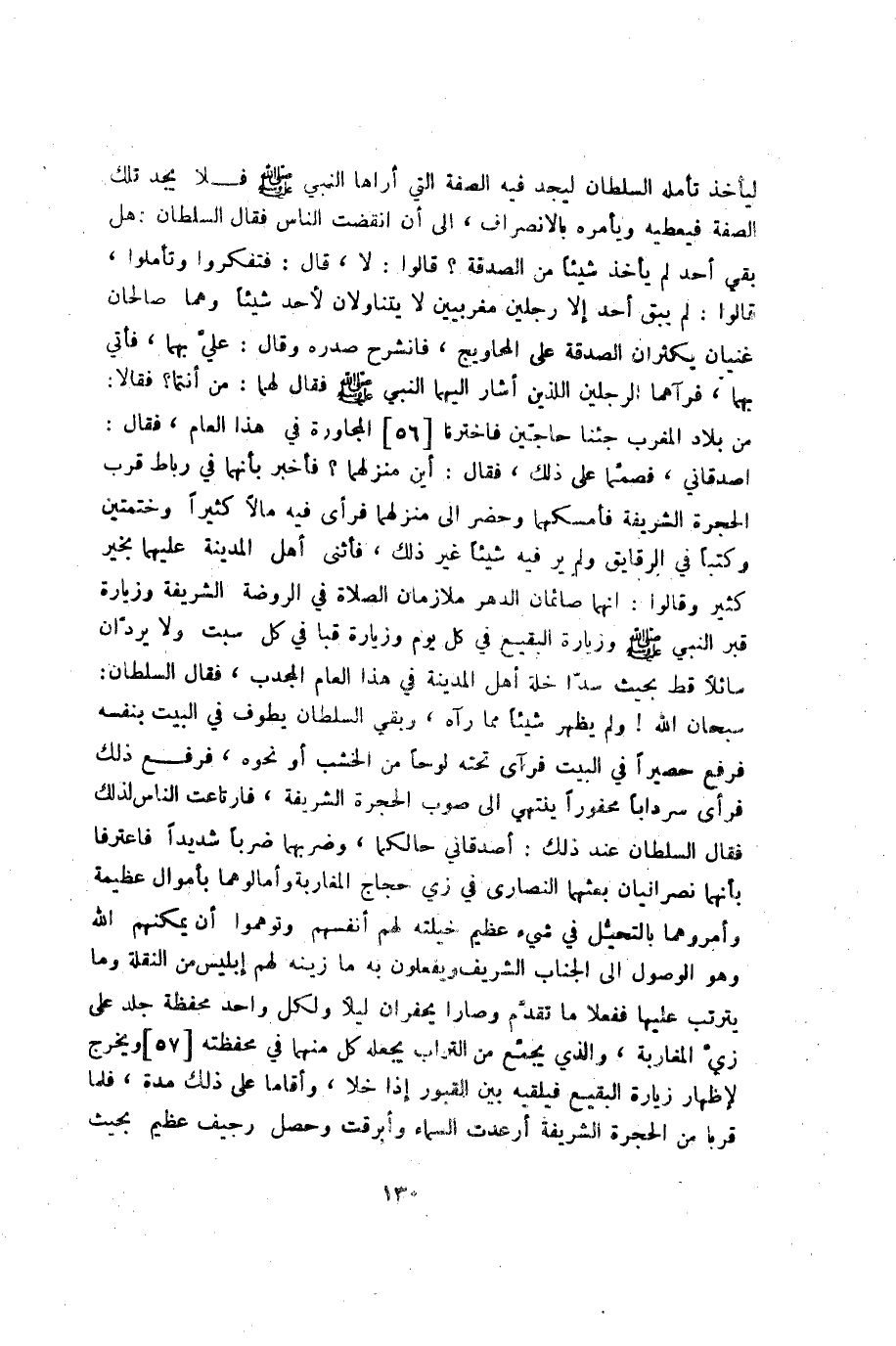 ليأخذ تأمله السلطان ليجد فيه الصفة التي أراها النبي صلى الله عليه وسلم فلا يجد تلك الصفة فيعطيه ويأمره بالانصراف، إلى أن انقضت الناس فقال السلطان: هل بقي أحد لم يأخذ شيئاً من الصدقة؟ قالوا: لا، قال: فتفكروا وتأملوا، قالوا: لم يبق أحد إلا رجلين مغربيين لا يتناولان لأحد شيئاً وهما صالحان غنيان يكثران الصدقة على المحاويج، فانشرح صدره وقال: علي بهما، فأتى بهما، فرآهما الرجلين اللذين أشار إليهما النبي صلى الله عليه وسلم فقال لهما: من أنتما؟ فقالا: من بلاد المغرب جئنا حاجين فاخترنا المجاورة في هذا العام، فقال: اصدقاني فصمم على ذلك، فقال أين منزلهما؟ فأخبر بأنهما في رباط قرب الحجرة الشريفة فأمسكهما وحضر إلى منزلهما فرأى فيه مالاً كثيراً وختمتين وكتباً في الرقايق ولم ير فيه شيئاً غير ذلك، فأثنى أهل المدينة عليهما بخير كثير وقالوا: إنهما صائمان الدهر ملازمان للصلاة في الروضة الشريفة وزيارة قبر النبي صلى الله عليه وسلم وزيارة البقيع في كل يوم وزيارة قبا في كل سبت ولا يردان سائلاً قط بحيث سدا خلة أهل المدينة في هذا العام المجدب، فقال السلطان، سبحان الله! ولم يظهر شيئاً مما رآه، وبقي السلطان يطوف في البيت بنفسه فرفع حصيراً في البيت فرآى تحته لوحاً من الخشب أو نحوه، فرفع ذلك فرأى سرداباً محفوراً ينتهى إلى صوب الحجرة الشريفة فارتاعت الناس لذلك فقال السلطان عند ذلك: اصدقاني حالكما، وضربهما ضرباً شديداً فاعترفا بأنهما نصرانيان بعثهما النصارى في زي حجاج المغاربة وأمالوهما بأموال عظيمة وأمروهما بالتحيل في شيء عظيم خيلته لهم أنفسهم وتوهموا أن يمكنهم الله وهو الوصول إلى الجناب الشريف ويفعلون به ما زينه لهم إبليس من النقلة وما يترتب عليها ففعلا ما تقدم وصارا يحفران ليلاً ولكل واحد محفظة جلد على زي المغاربة، والذي يجمع من التراب يجعله كل منهما في محفظته ويخرج لإظهار زيارة البقيع فيلقيه بين القبور إذا خلا، وأقاما على ذلك مدة فلما قربا من الحجرة الشريفة أرعدت السماء وأبرقت وحصل رجيف عظيم بحيث