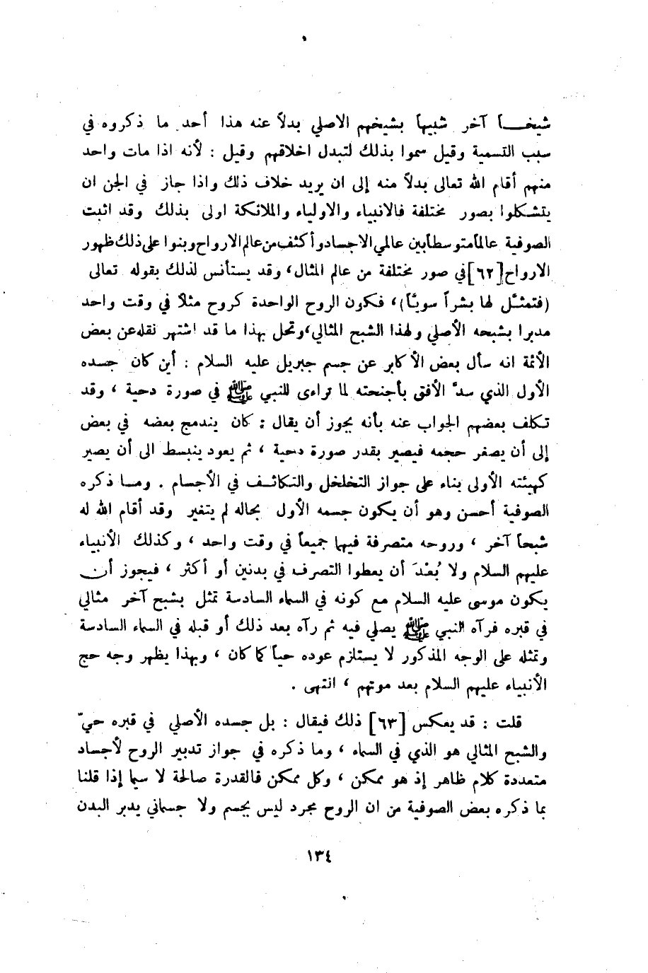 وما ذكره الصوفية أحسن وهو أن يكون جسمه الأول بحاله لم يتغير، وقد أقام الله تعالى شبحاً آخر، وروحه متصرفة فيهما جميعاً في وقت واحد، وكذلك الأنبياء عليهم السلام ولا بعد أن يعطوا التصرف في بدنين أو أكثر، فيجوز أن يكون موسى عليه السلام مع كونه في السماء السادسة تمثل بشبح آخر مثالي في قبره فرآه صلى الله عليه وسلم يصلي فيه ثم رآه بعد ذلك أو قبله في السماء السادسة وتمثله على الوجه المذكور لايستلزم عوده حياً كما كان، وبهذا يظهر وجه حج الأنبياء عليهم السلام بعد موتهم، قلت: قد يعكس ذلك فيقال بل جسده الأصلي في جسده حي والشبخ المثالي هو الذي في السماء، وما ذكره في جواز تدبير الروح لأجساد متعددة كلام ظاهر إذ هو ممكن، وكل ممكن فالقدرة صالحة لا سيما إذا قلنا بما ذكره بعض الصوفية من أن الروح مجرد ليس بجسم ولا جسماني يدبر البدن