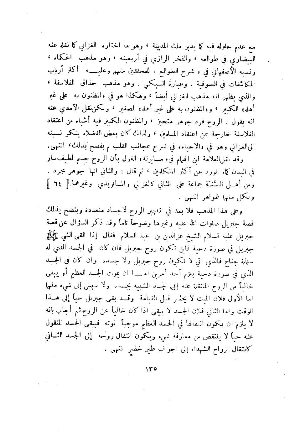 وعلى هذه المذاهب فلا بد في تدبير الروح لأجساد متعددة ويتضح بذلك قصة جبريل صلوات الله عليه وغيرها وضوحاً وتاماً وقد ذكر السؤال عن قصة جبريل عليه السلام الشيخ عز الدين بن عبد السلام فقال إذا لقى النبي صلى الله عليه وسلم جبريل في صورة دحية فأين تكون روح جبريل فإن كان في الجسد الذي له ستماية جناح فالذي أتى لا تكون روح جبريل ولا جسده وإن كان في الجسد الذي في صورة دحية يلزم أحد أمرين: إما أن يموت الجسد العظيم، أو يبقى خالياً من الروح المنتقلة عنه إلى الجسد الشبيه بجسده ولا سبيل إلى شيء منهما أما الأول فإن الميت لا يحشر قبل القيامة وقد بقي جبريل حياً إلى هذا الوقت. وأما الثاني: فإن الجسد لا يبقى إذا كان خالياً عن الروح، ثم أجاب بأنه لا يلزم أن يكون انتقالها في الجسد العظيم موجباً لموته فيبقى الجسد المنقول عنه حياً لا ينتقص من معارفه شيء ويكون انتقال روحه إلى الجسد الثاني كانتقال أرواح الشهداء إلى أجواف طير خضر. انتهى.