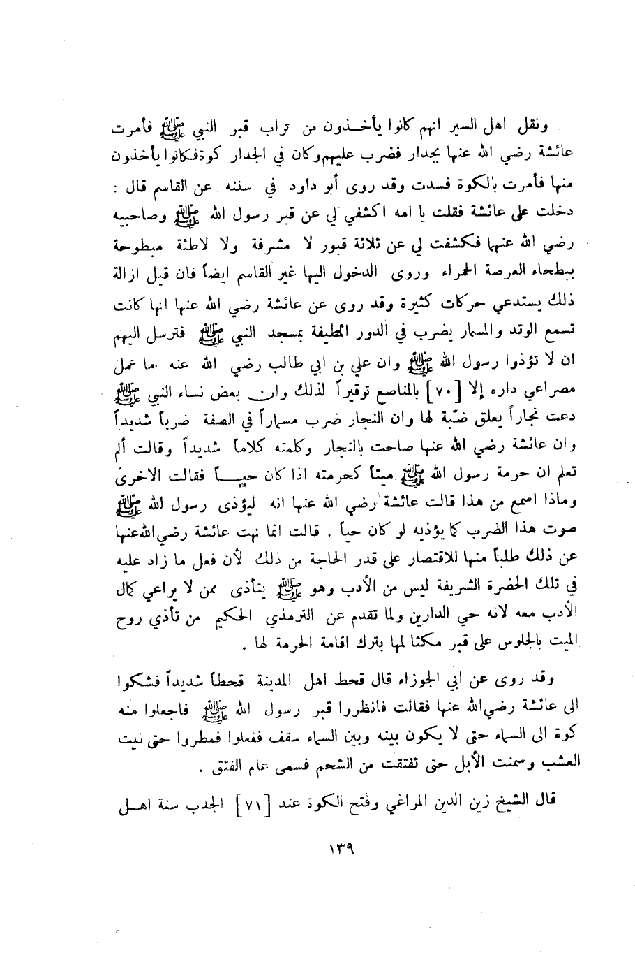 وقد روى أبو داود في سننه عن القاسم قال: دخلت على عائشة فقلت يا أمه اكشفي لي عن قبر رسول الله صلى الله عليه وسلم وصاحبيه رضي الله عنهما فكشفت لي عن ثلاثة قبور لا مشرفة ولا لاطئة مبطوحة ببطحاء العرصة الحمراء وروى الدخول إليها غير القاسم أيضاً فإن قيل إزالة ذلك يستدعي حركات كثيرة وقد روى عن عائشة رضي الله عنها إنها كانت تسمع الوتد والمسمار يضرب في الدور المطيفة بمسجد النبي صلى الله عليه وسلم فترسل إليهم أن لا تؤذوا رسول الله صلى الله عليه وسلم وأن علي بن أبي طالب رضي الله عنه ما عمل مصراعي داره إلا بالمناصع توقيراً لذلك وأن بعض نساء النبي صلى الله عليه وسلم دعت نجاراً يعلق ضبة لها وأن النجار ضرب مسماراً في الصفة ضرباً شديداً وأن عائشة رضي الله عنها صاحت بالنجار وكلمته كلاماً شديداً وقالت: ألم تعلم أن حرمة رسول الله صلى الله عليه وسلم ميتاً كحرمته إذا كان حياً؟ فقالت الأخرى وماذا أسمع من هذا قالت عائشة رضي الله عنها إنه ليؤذي رسول الله صلى الله عليه وسلم صوت هذا الضرب كما يؤذيه لو كان حياً.