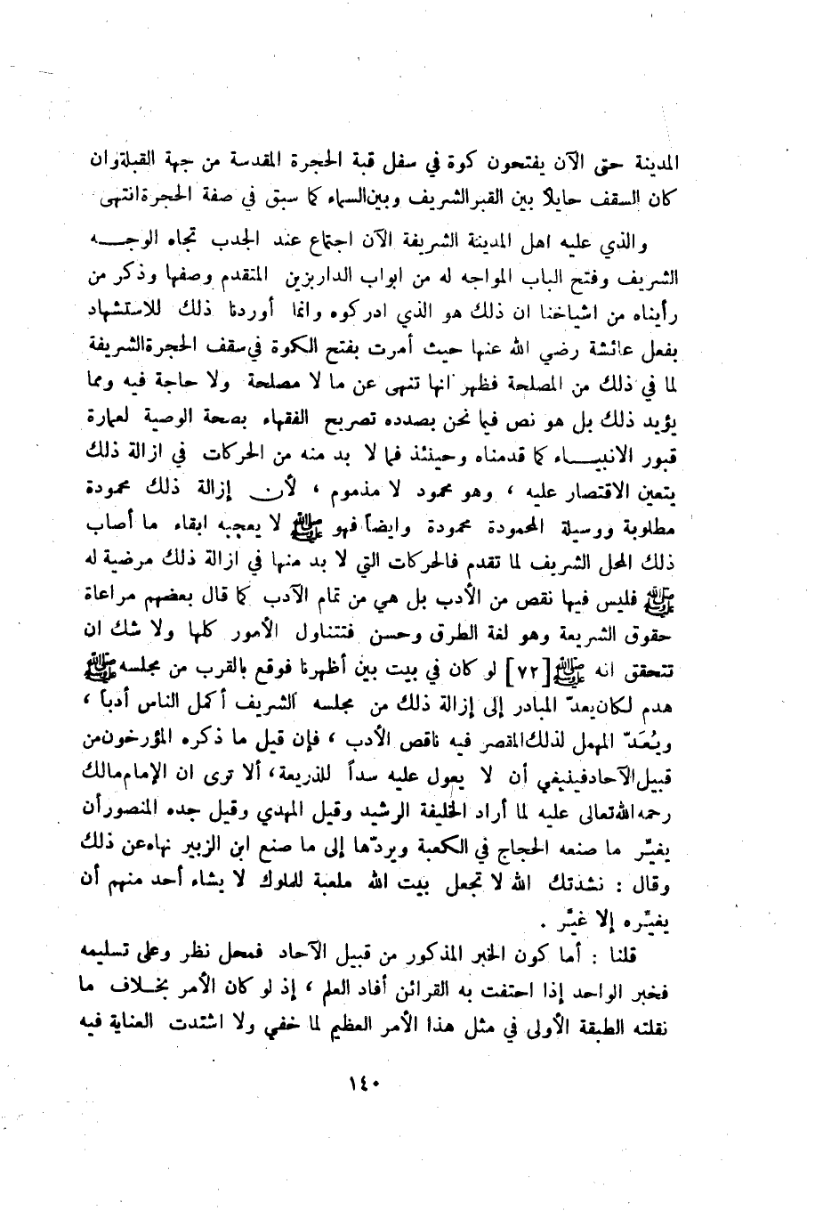 …والذي عليه أهل المدينة الشريفة الآن اجتماع عند الجدب تجاه الوجه الشريف وفتح الباب المواجه له من أبواب الدرابزين المتقدم وصفها وذكر من رأيناه من أشياخنا أن ذلك هو الذي أدركوه وإنما أوردنا ذلك للاستشهاد بفعل عائشة رضي الله عنها حيث أمرت بفتح الكوة في سقف الحجرة الشريفة لما في ذلك من المصلحة فظهر أنها تنهى عن مالا مصلحة ولا حاجة فيه ومما يؤيد ذلك بل هو نص فيما نحن بصدده تصريح الفقهاء بصحة الوصية لعمارة قبور الأنبياء كما قدمناه و حينئذ فما لابد من الحركات في إزالة ذلك يتعين الاقتصار عليه، وهو محمود لا مذموم، لأن إزالة ذلك محمودة مطلوبة ووسيلة المحمودة محمودة وأيضاً فهو صلى الله عليه وسلم لا يعجبه إبقاء ما أصاب ذلك المحل الشريف لما تقدم فالحركات التي لابد منها في إزالة ذلك مرضية له صلى الله عليه وسلم فليس فيها نقص من الأدب بل هي من تمام الآداب كما قال بعضهم مراعاة حقوق الشريعة وهي لغة الطرق وحسن فتتناول الأمور كلها ولا شك أن تتحقق أنه صلى الله عليه وسلم لو كان في بيت بين أظهرنا فوقع بالقرب من مجلسه صلى الله عليه وسلم هدم لكان يعد المبادر إلى إزالة ذلك من مجلسه الشريف أكمل الناس أدباً، ويعد المهمل لذلك المقصر فيه ناقص الأدب، فإن قيل ما ذكره المؤرخون من قبيل الآحاد فينبغي أن لا يعول عليه سداً للذريعة، ألا ترى أن الإمام مالك رحمة الله تعالى عليه لما أراد الخليفة الرشيد وقيل المهدي وقيل جده المنصور أن يغير ما صنعه الحجاج في الكعبة ويردها إلى ما صنعه ابن الزبير في الكعبة نهاه عن ذلك وقال: نشدتك الله لا تجعل بيت الله ملعبة للملوك لا يشاء أحد منهم أن يغيره إلا غير.
