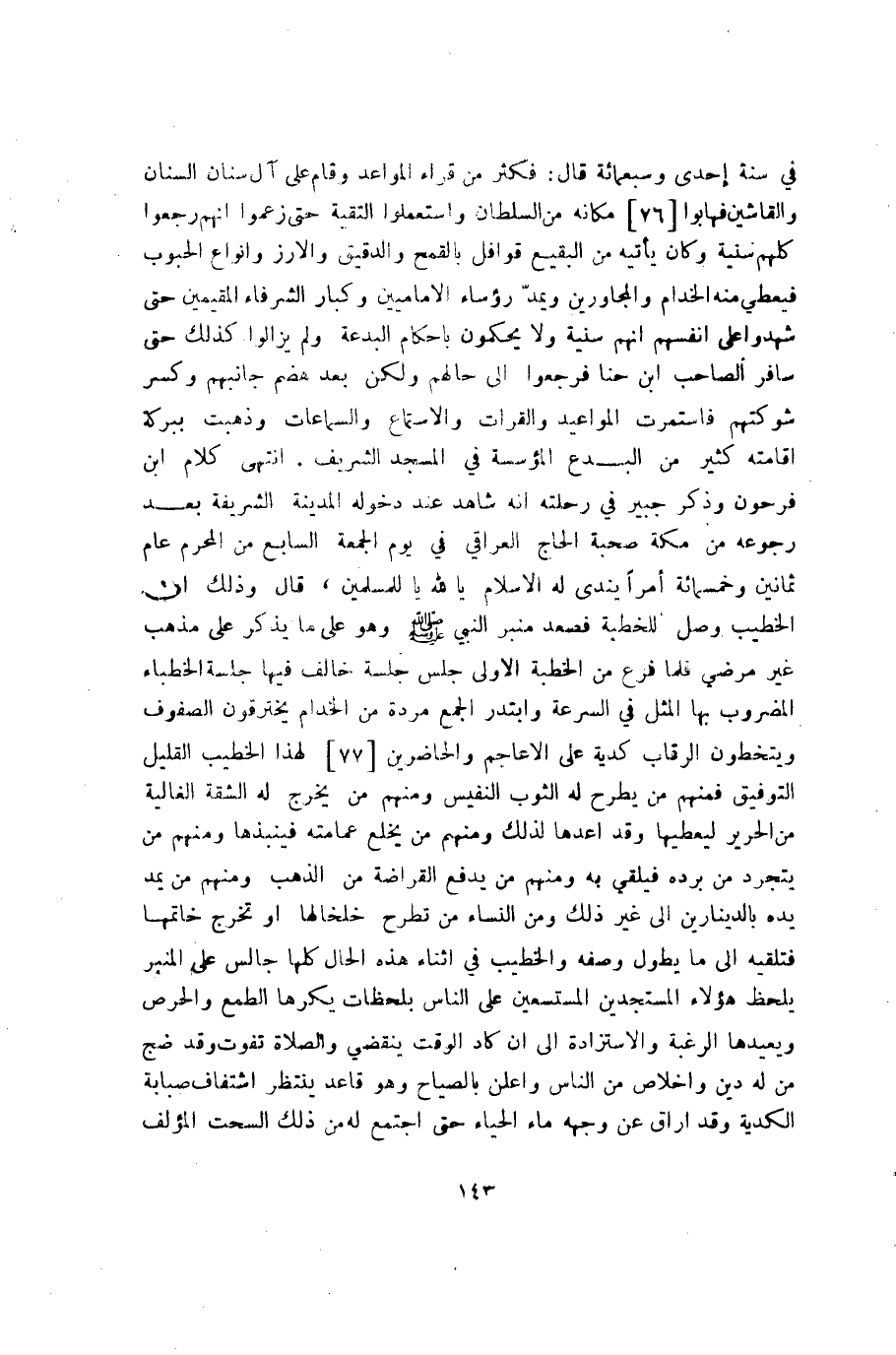في سنة إحدى وسبعمائة قال: فكثر من قراء المواعد وقام على آل سنان السنان والقاشين فهابوا مكانه من السلطان واستعملوا التقية حتى زعموا أنهم رجعوا كلهم سنية وكان يأتيه من البقيع قوافل بالقمح والدقيق والأرز وأنواع الحبوب فيعطي منه الخدام والمجاورين ويمد رؤساء الإمامين وكبار الشرفاء المقيمين حتى شهدوا على أنفسهم أنهم سنية ولا يحكمون بأحكام البدعة ولم يزالوا كذلك حتى سافر الصاحب ابن حنا فرجعوا إلى حالهم ولكن بعد هضم جانبهم وكسر شوكتهم فاستمرت المواعيد والقرات والاستماع والسماعات وذهبت ببركة إقامته كثير من البدع المؤسسة في المسجد الشريف. انتهى كلام ابن فرحون… وذكر ابن جبير في رحلته أنه شاهد عند دخول المدينة الشريفة بعد رجوعه من مكة صحبة الحاج العراقي في يوم الجمعة السابع من المحرم عام ثمانين وخمسمائة أمراً يندى له الإسلام يا لله يا للمسلمين، قال وذلك أن الخطيب وصل للخطبة فصعد منبر النبي صلى الله عليه وسلم وهو على ما يذكر على مذهب غير مرضي فلما فرغ من الخطبة الأولى جلس جلسة خالف فيها جلسة الخطباء المضروب بها المثل في السرعة وابتدر الجمع مردة من الخدام يخترقون الصفوف ويتخطون الرقاب كدية على الأعاجم والحاضرين لهذا الخطيب القليل التوفيق فمنهم من يطرح له الثوب النفيس ومن يخرج له الشقة الغالية من الحرير ليعطيها وقد أعدها لذلك ومنهم من يخلع عمامته فينبذها ومنهم من يتجرد من برده فيلقي به ومنهم من يدفع القراضة من الذهب ومنهم من يمد يده بالدينارين إلى غير ذلك ومن النساء من تطرح خلخالها أو تخرج خاتمها فتلقيه إلى ما يطول وصفه والخطيب في أثناء هذه الحال كلها جالس على المنبر يلحظ هؤلاء المستجدين المستسعين على الناس بلحظات يكرهها الطمع والحرص ويعيدها الرغبة والاستزادة إلى أن كاد الوقت ينقضي والصلاة تفوت وقد ضج من له دين وإخلاص من الناس وأعلن بالصياح وهو قاعد ينتظر اشتفاف صبابة الكدية وقد أراق عن وجهه ماء الحياء حتى اجتمع له من ذلك السحت المؤلف
