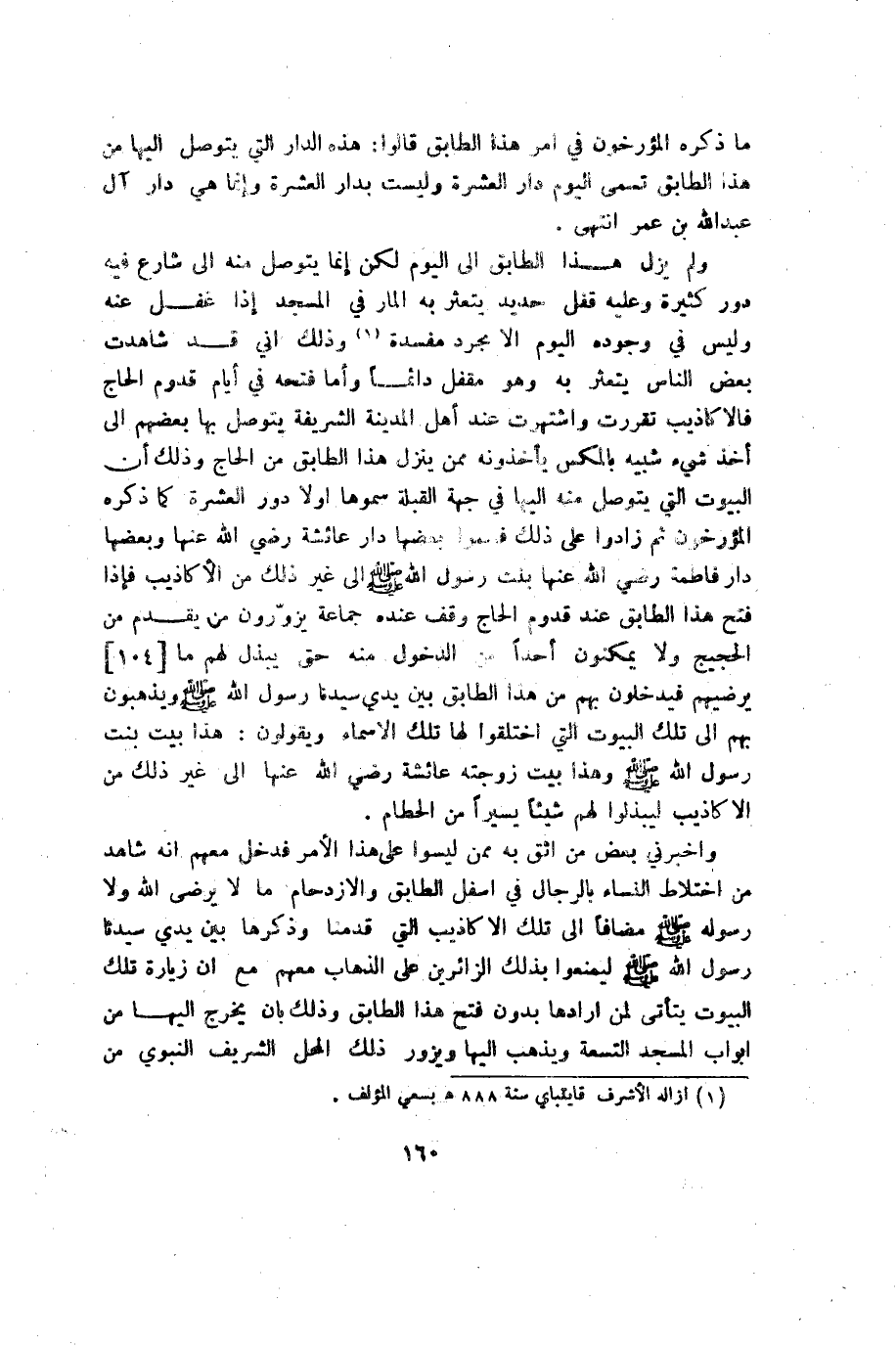 ولم يزل هذا الطابق إلى اليوم لكن إنما يتوصل منه إلى شارع فيه دور كثيرة وعليه قفل حديد يتعثر به المار في المسجد إذا غفل عنه وليس في وجوده اليوم إلا مجرد مفسدة وذلك أني قد شاهدت بعض الناس يتعثر به وهو مقفل دائماً وأما فتحه في أيام قدوم الحاج فالأكاذيب تقررت واشتهرت عند أهل المدينة الشريفة يتوصل بها بعضهم إلى أخذ شيء شبيه بالمكس يأخذونه ممن ينزل هذا الطابق من الحاج وذلك أن البيوت التي يتوصل منها إليها في جهة القبلة سموها أولاً دار العشرة كما ذكره المؤرخون ثم زادوا على ذلك فسموا بعضها دار عائشة رضي الله عنها وبعضها دار فاطمة رضي الله عنها بنت رسول الله صلى الله عليه وسلم إلى غير ذلك من الأكاذيب فإذا فتح هذا الطابق عند قدوم الحاج وقف عندهم جماعة يزورون من يقدم من الحجيج ولا يمكنون أحداً من الدخول منه حتى يبذل لهم ما يرضيهم فيدخلون به من هذا الطابق بين يدي سيدنا رسول الله صلى الله عليه وسلم يذهبون بهم إلى تلك البيوت التي اختلقوا لها تلك الأسماء ويقولون: هذا بيت بنت رسول الله صلى الله عليه وسلم وهذا بيت عائشة رضي الله عنها إلى غير ذلك من الأكاذيب ليبذلوا لهم شيئاً يسيراً من الحطام.