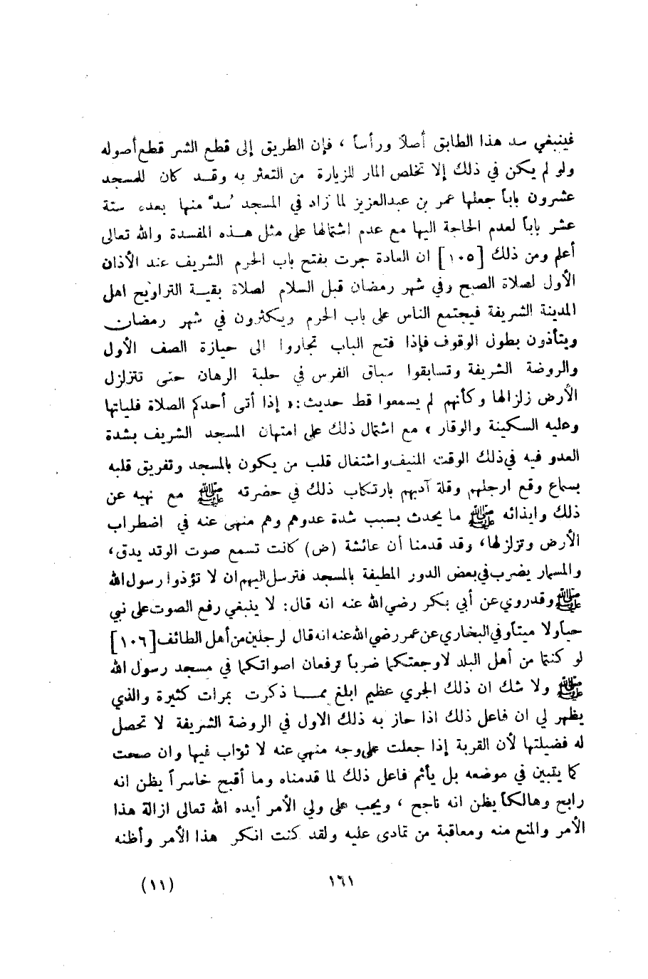 … ومن ذلك أن العادة جرت بفتح باب الحرم الشريف عند الأذان الأول لصلاة الصبح وفي شهر رمضان قبل السلام لصلاة بقية التراويح أهل المدينة الشريفة فيجتمع الناس على باب الحرم ويكثرون في شهر رمضان ويتأذون بطول الوقوف فإذا فتح الباب تجاروا إلى حيازة الصف الأول والروضة الشريفة وتسابقوا سباق الفرس في حلبة الرهان حتى تتزلزل الأرض زلزالها وكأنهم لم يسمعوا قط حديث: (إذا أتى أحدكم الصلاة فليأتها وعليه السكينة والوقار) مع اشتمال ذلك على امتهان المسجد الشريف بشدة العدو في ذلك الوقت المنيف واشتغال قلب من يكون بالمسجد وتفريق قلبه بسماع وقع أرجلهم وقلة أدبهم بارتكاب ذلك في حضرته صلى الله عليه وسلم مع نهيه عن ذلك وإيذائه صلى الله عليه وسلم ما يحدث بسبب شدة عدوهم وهو منهي عنه في اضطراب الأرض وتزلزلها، وقد قدمنا أن عائشة رضي الله عنها كانت تسمع صوت الوتد يدق، والمسمار يضرب في بعض الدور المطيفة بالمسجد فترسل إليهم أن لا تؤذوا رسول الله صلى الله عليه وسلم وقد روي عن أبي بكر رضي الله عنه أنه قال: لا ينبغي رفع الصوت على النبي حياً ولا ميتاً. … وفي البخاري عن عمر رضي الله عنه أنه قال لرجلين من أهل الطائف لو كنتما من أهل البلد لأوجعتكما ضرباً ترفعان أصواتكما في مسجد رسول الله صلى الله عليه وسلم؟!
